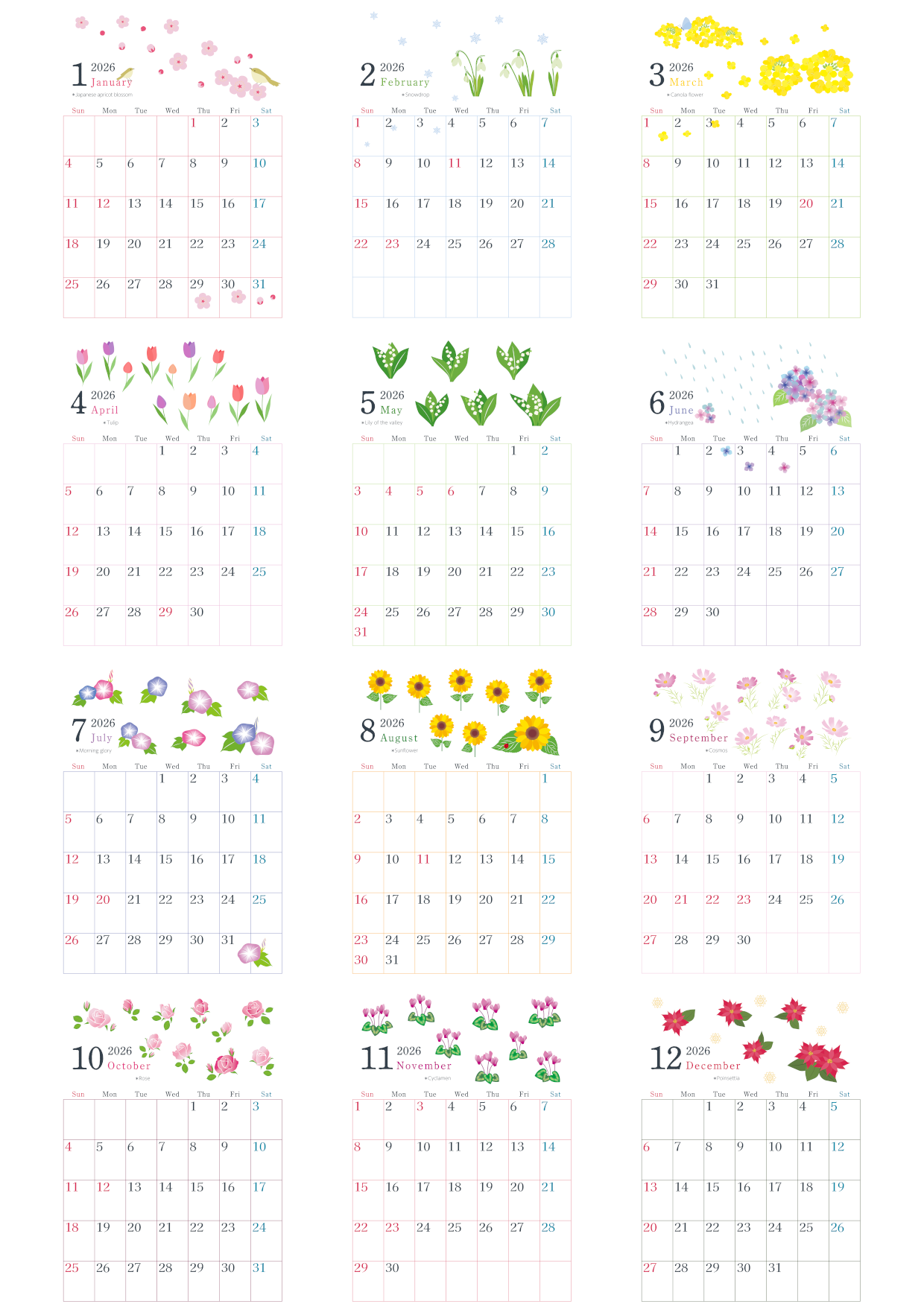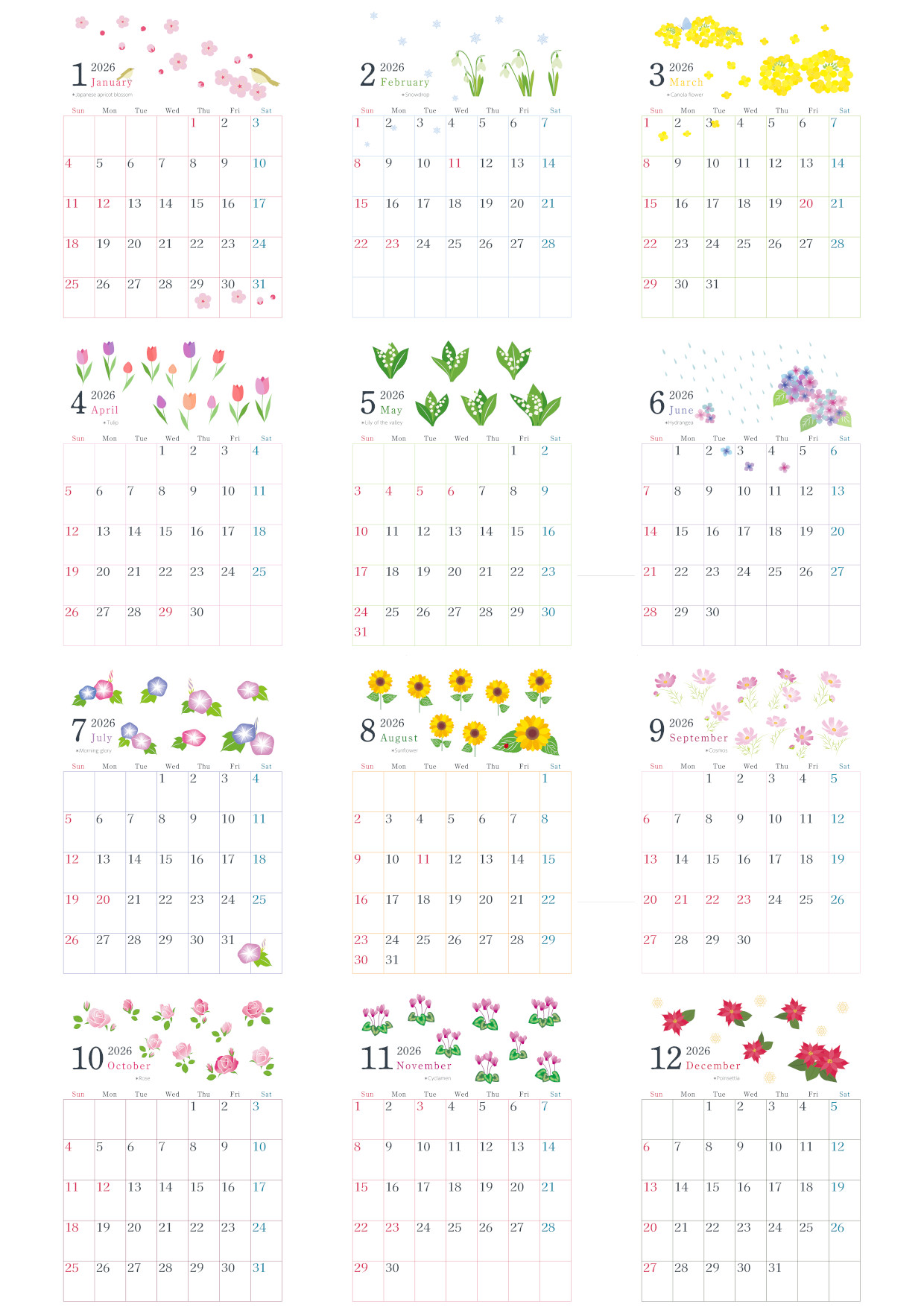 2026年間カレンダー♪A4縦型の日曜始まりで草花のイラストが心地よい落ち着いたデザイン!無料ダウンロード可能!