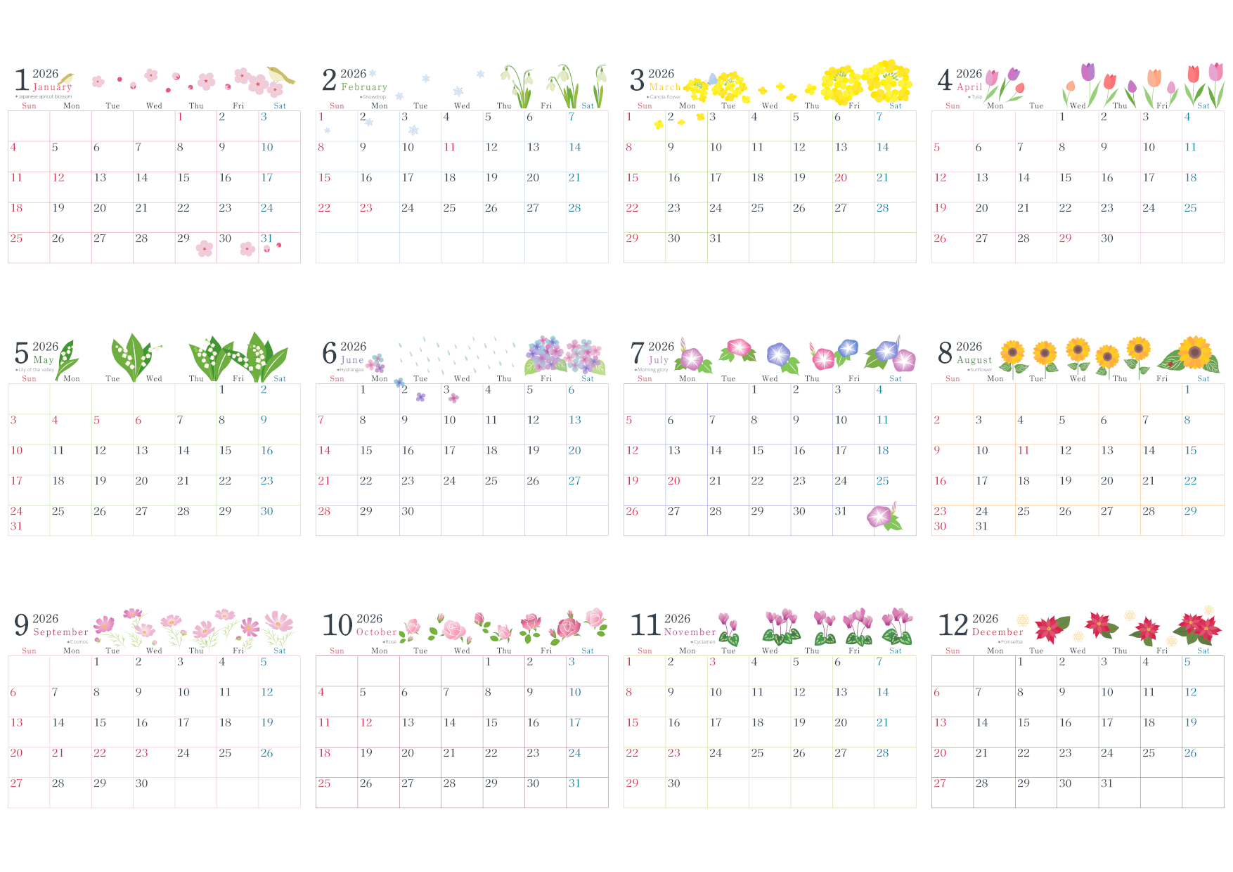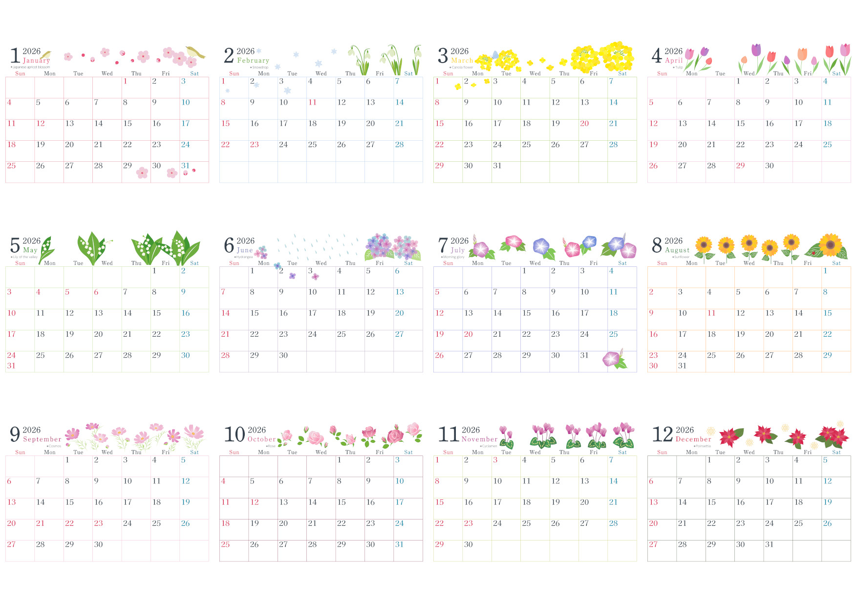 A4一枚で使える2026年の年間カレンダーを無料ダウンロードできます。横向きの日曜始まりで、印刷しやすいインク節約デザインが特徴です。シンプルで整った構成は、予定を書き込んでも見やすく、実用性を重視する方にぴったりです。学校や職場、自治会などで配布用にも利用しやすい便利なフリー素材です。