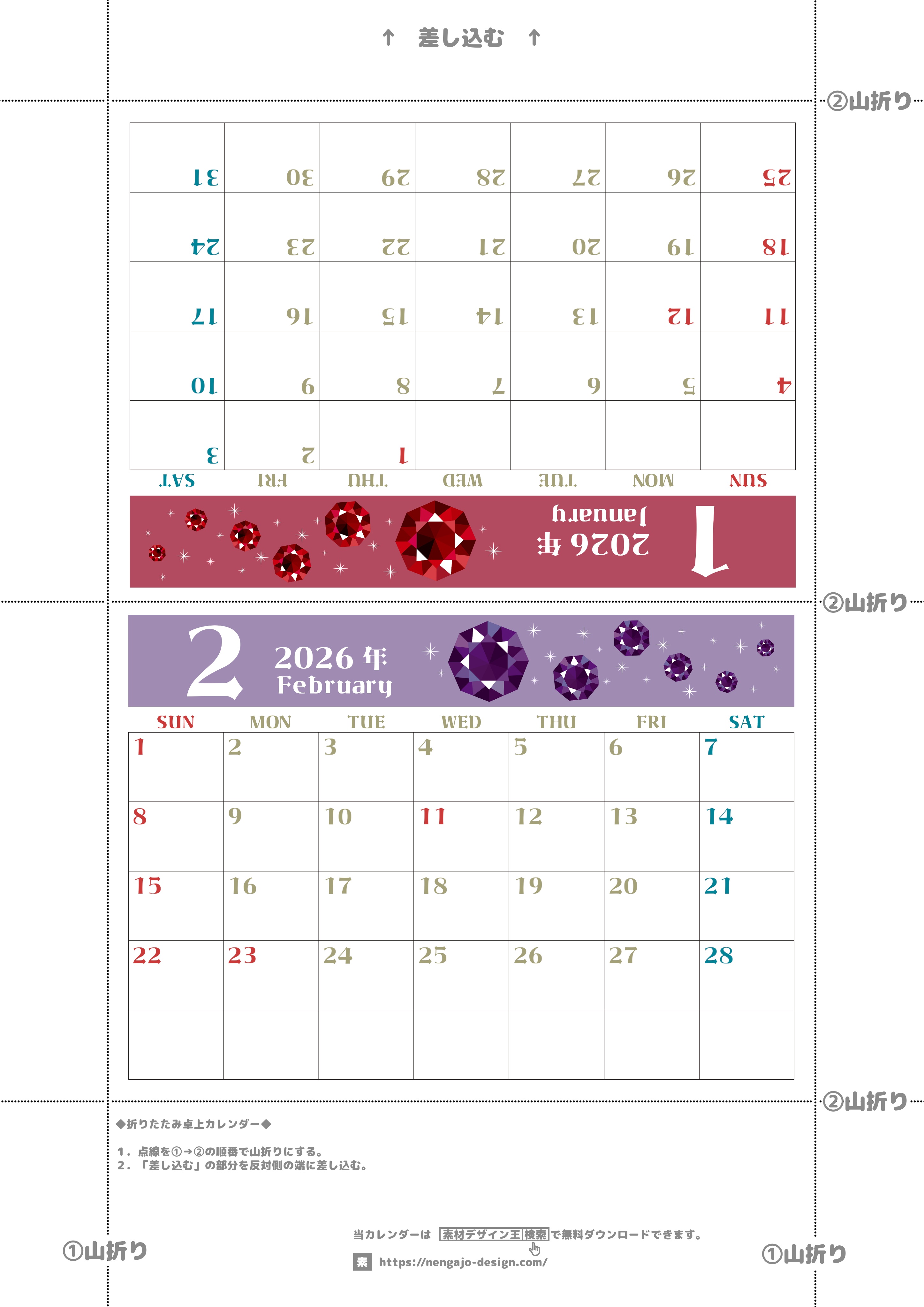 2026年・無料のカレンダーテンプレート 2026年の卓上カレンダー(1月・2月)は日曜始まり♪おしゃれで文字も大きめで見やすい♪無料でA4プリント♪(2026-002001-0230) 素材状デザイン王 2025年4月14日 2025.12.30 2026年の卓上カレンダー(1月・2月)は日曜始まりです。おしゃれなだけでなく文字も大きめなので卓上サイズでコンパクトですが見やすいです。無料ダウンロードしてプリント利用をしましょう。(2026-002001-0230) おしゃれ カレンダーデザイン-0020 1月 2月 誕生石・宝石 日曜始まり 卓上