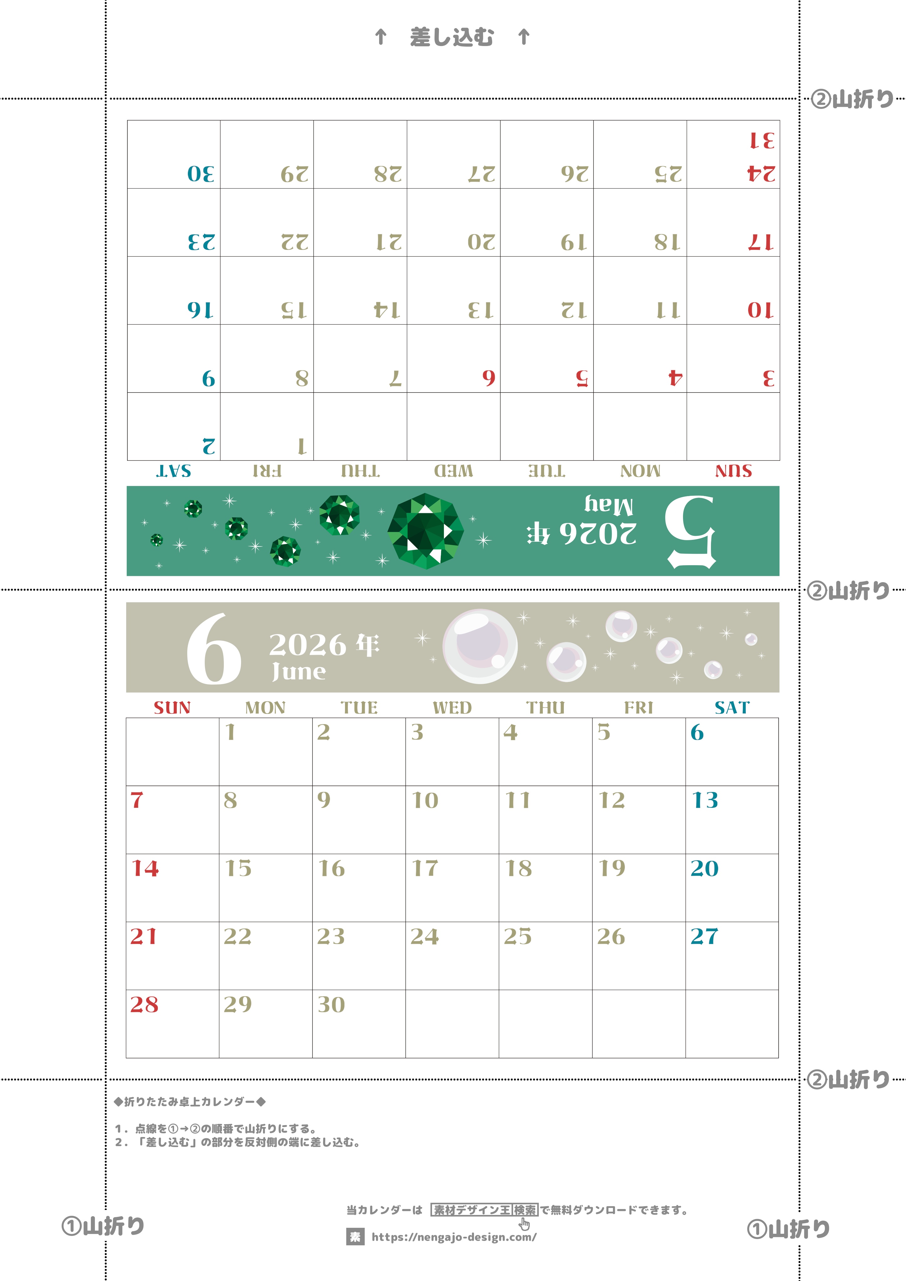 2026年・無料のカレンダーテンプレート 2026年の卓上カレンダー(5月・6月)は日曜始まり♪おしゃれで文字も大きめで見やすい♪無料でA4プリント♪(2026-002005-0630) 素材状デザイン王 2025年4月14日 2025.12.30 2026年の卓上カレンダー(5月・6月)は日曜始まりです。おしゃれなだけでなく文字も大きめなので卓上サイズでコンパクトですが見やすいです。無料ダウンロードしてプリント利用をしましょう。(2026-002005-0630) おしゃれ カレンダーデザイン-0020 5月 6月 誕生石・宝石 日曜始まり 卓上