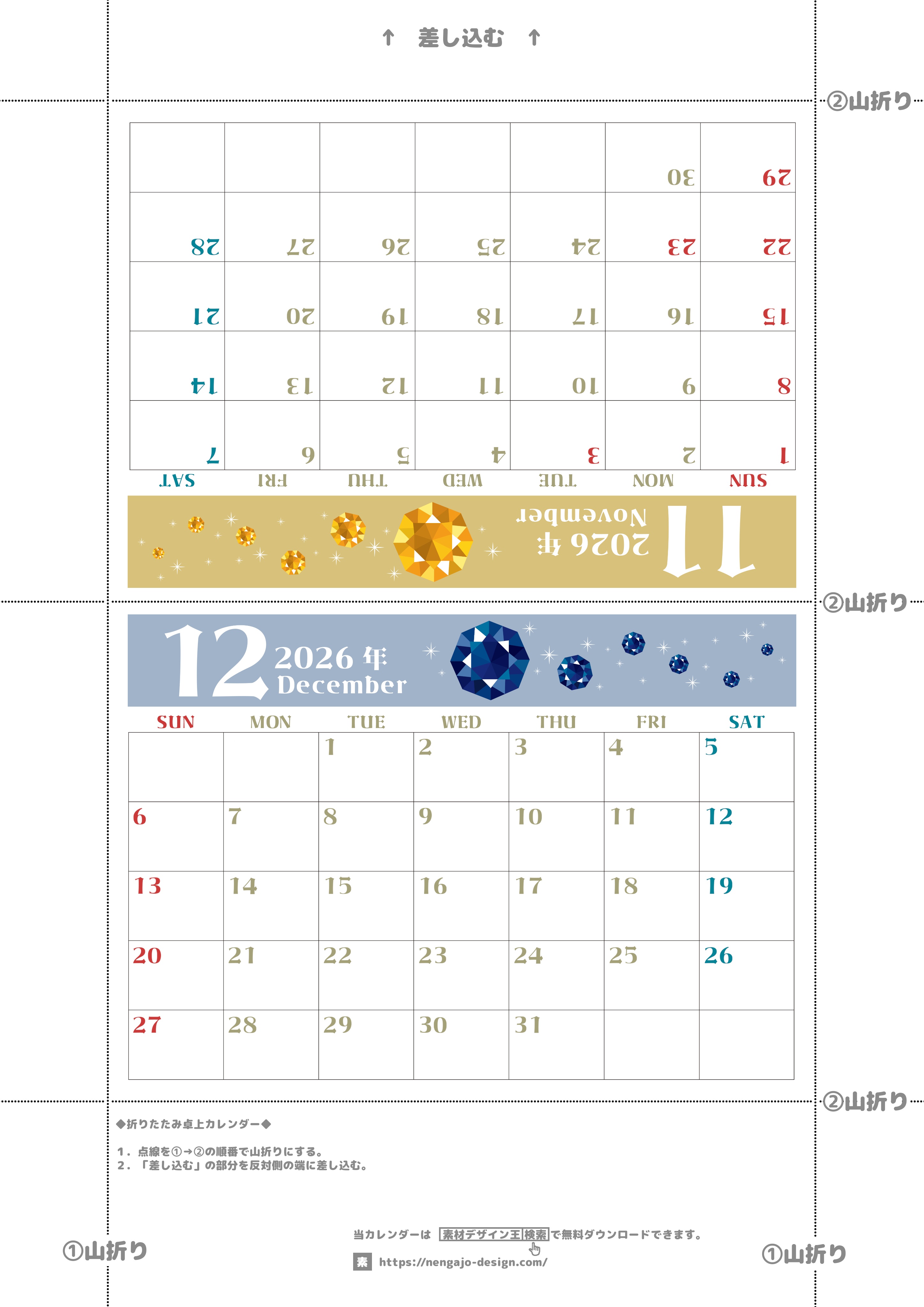 2026年・無料のカレンダーテンプレート 2026年の卓上カレンダー(11月・12月)は日曜始まり♪おしゃれで文字も大きめで見やすい♪無料でA4プリント♪(2026-002011-1230) 素材状デザイン王 2025年4月14日 2025.12.30 2026年の卓上カレンダー(11月・12月)は日曜始まりです。おしゃれなだけでなく文字も大きめなので卓上サイズでコンパクトですが見やすいです。無料ダウンロードしてプリント利用をしましょう。(2026-002011-1230) おしゃれ カレンダーデザイン-0020 11月 12月 誕生石・宝石 日曜始まり 卓上