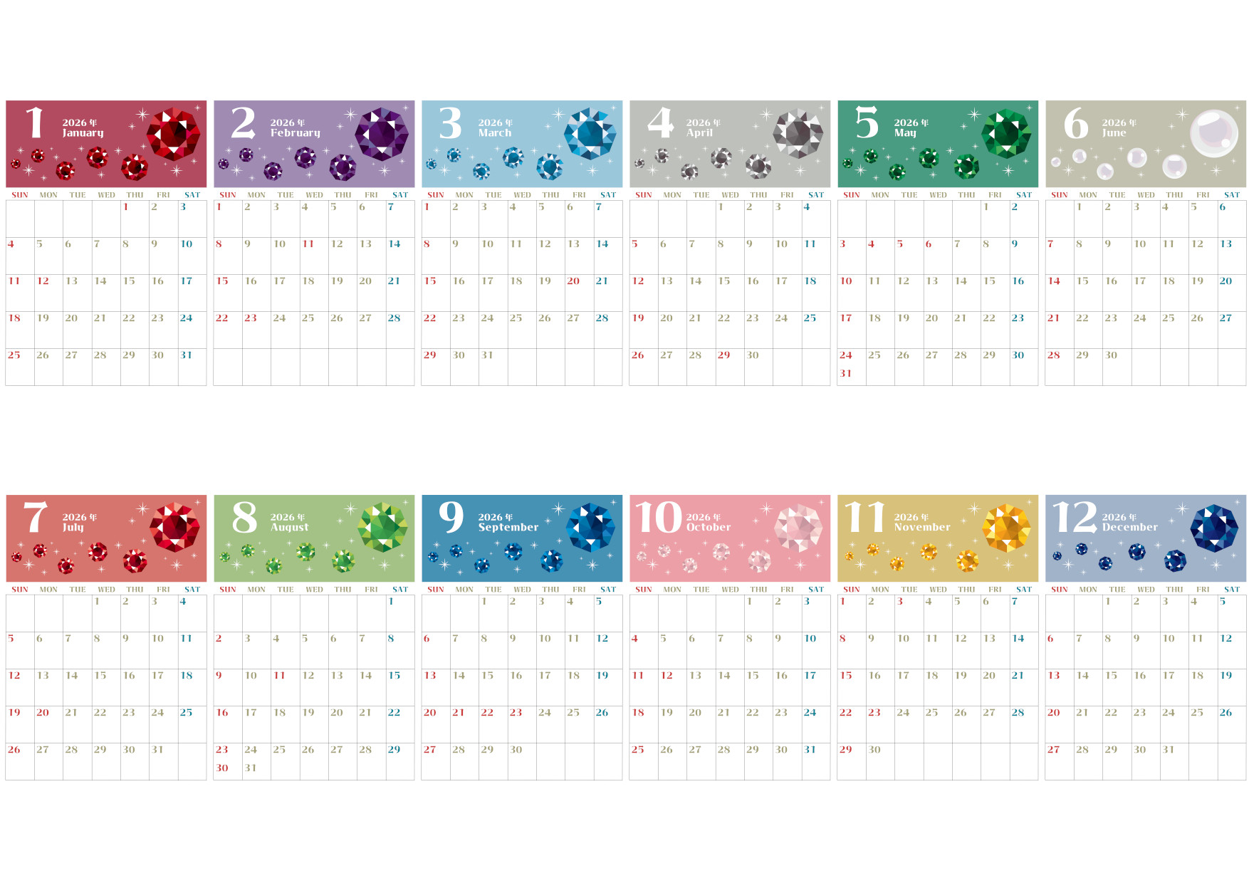 A4縦型で使える2026年の年間カレンダーを無料ダウンロードできます。日曜始まりで、女性に人気の誕生石デザインが魅力です。一年の楽しみとして飾っても華やかで、予定管理を特別な時間にしてくれます。上品な雰囲気が特徴の便利なフリー素材です。