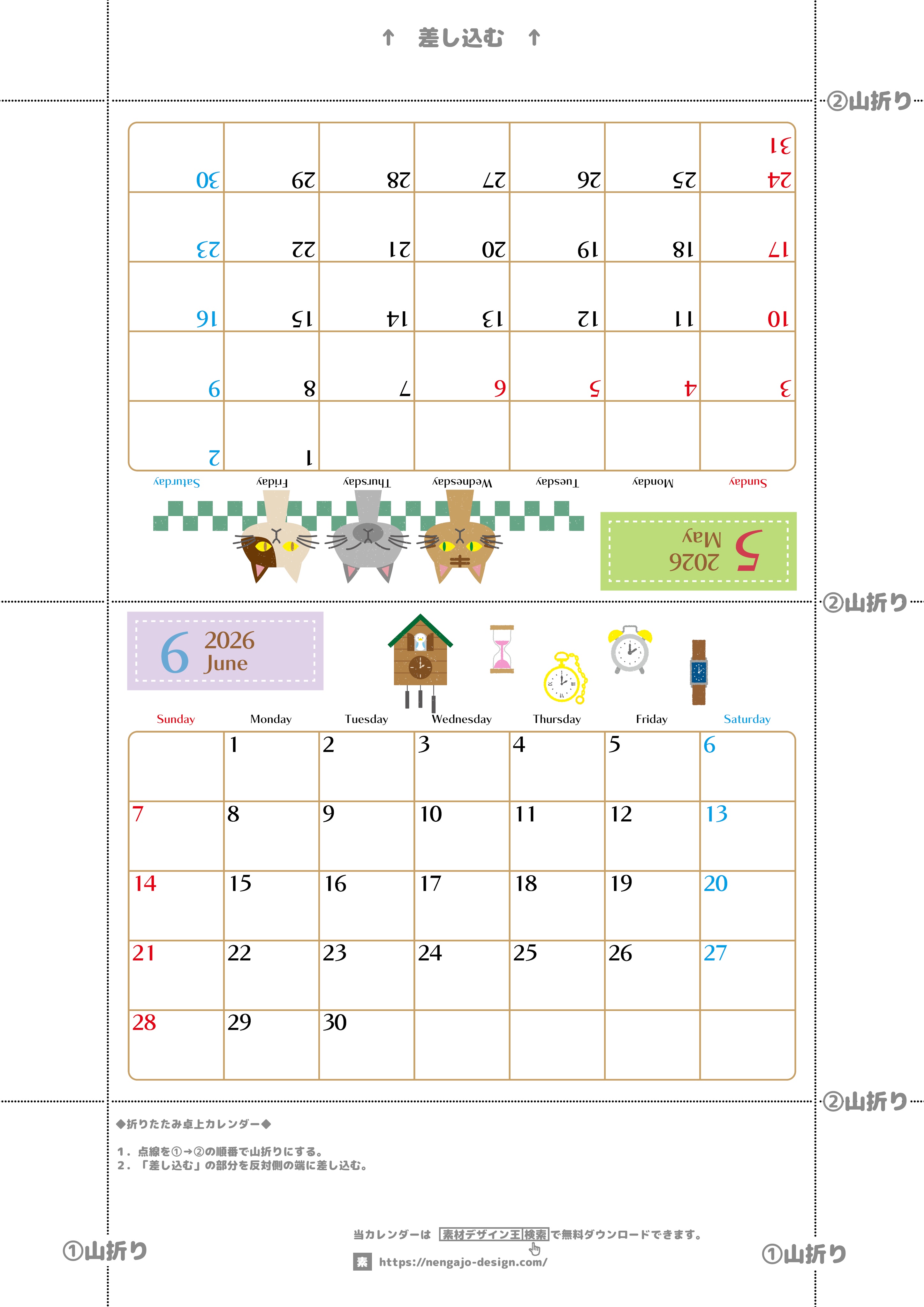 2026年の卓上カレンダー(5月・6月)は日曜始まり♪かわいい文字も大きめで見やすい♪無料でA4プリント♪(2026-002105-0630)