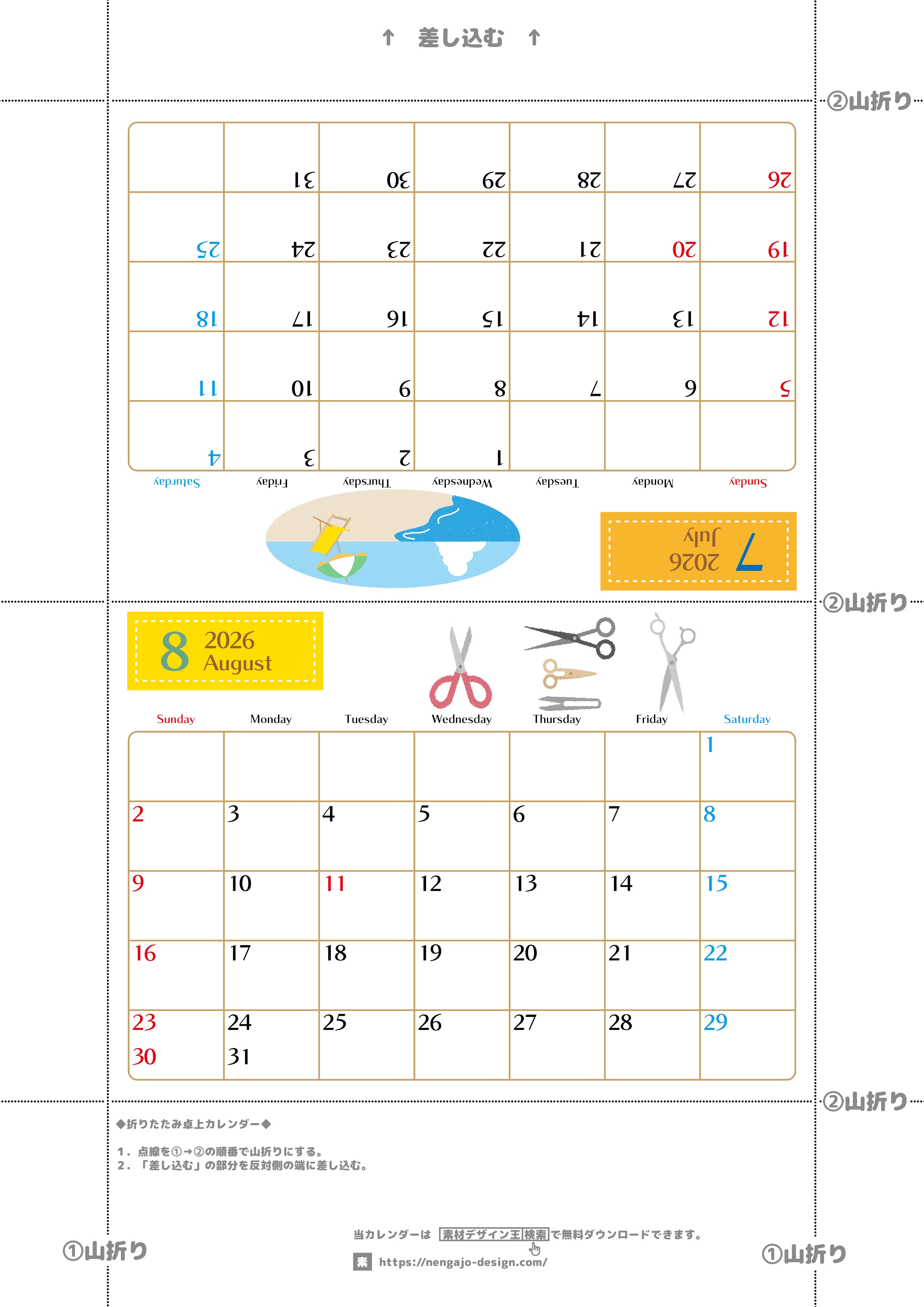 2026年の卓上カレンダー(7月・8月)は日曜始まり♪かわいい文字も大きめで見やすい♪無料でA4プリント♪(2026-002107-0830)