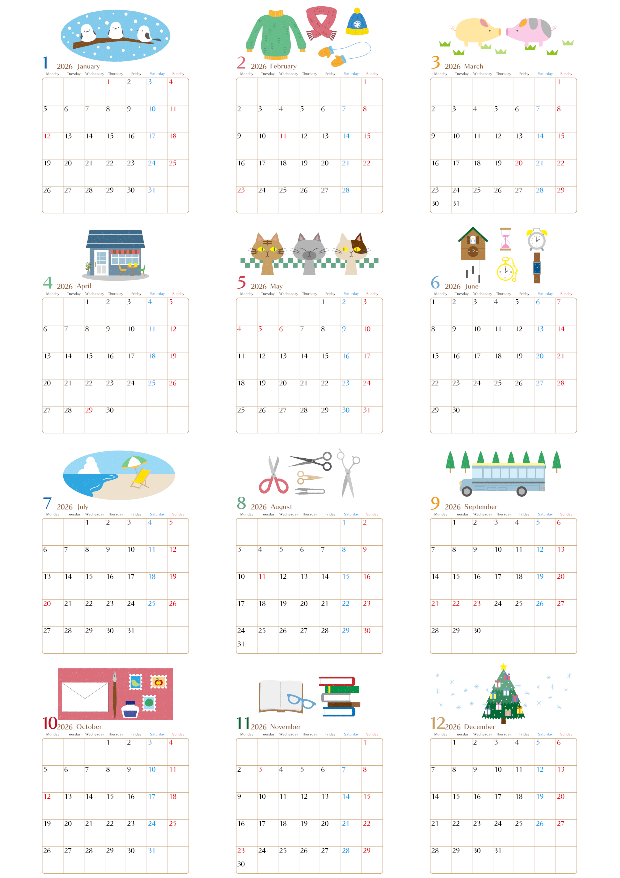 洗練されたデザインで仕上げた2026年の年間カレンダーです。A4縦型で月曜始まりの構成は、仕事や学校の予定と合わせやすく、年間計画表として活用しやすいのが特徴。全体的に余白が広めに設計されているため、重要なイベントや目標なども書き込みやすく、家族で共有するスケジュールとしても便利です。静かな雰囲気のデザインは部屋のインテリアも損なわず、長く使っても飽きません。無料でダウンロードできます。