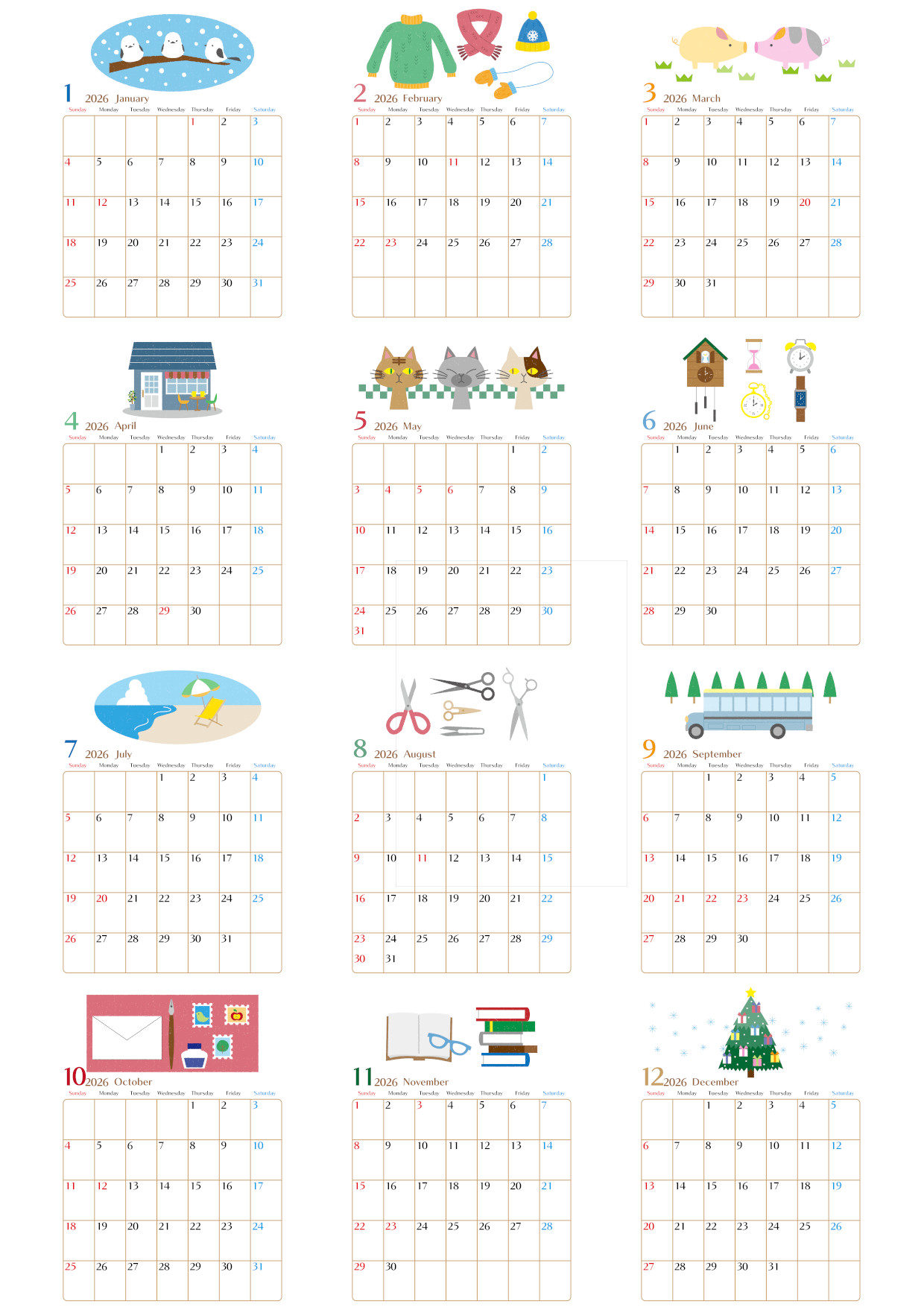 落ち着いたかわいらしさが魅力のデザインでまとめられた2026年の年間カレンダーです。A4縦型で日曜始まりのレイアウトは、壁掛けにもぴったりの形で、お部屋の雰囲気を崩さずに自然になじみます。やさしい印象のデザインは毎日眺めるたびに心を和ませてくれ、家族で共有するスケジュール表としても活躍します。使い勝手のよい実用的な構成で、学校の予定や仕事の管理にも便利。無料でダウンロードしてすぐに利用できます。