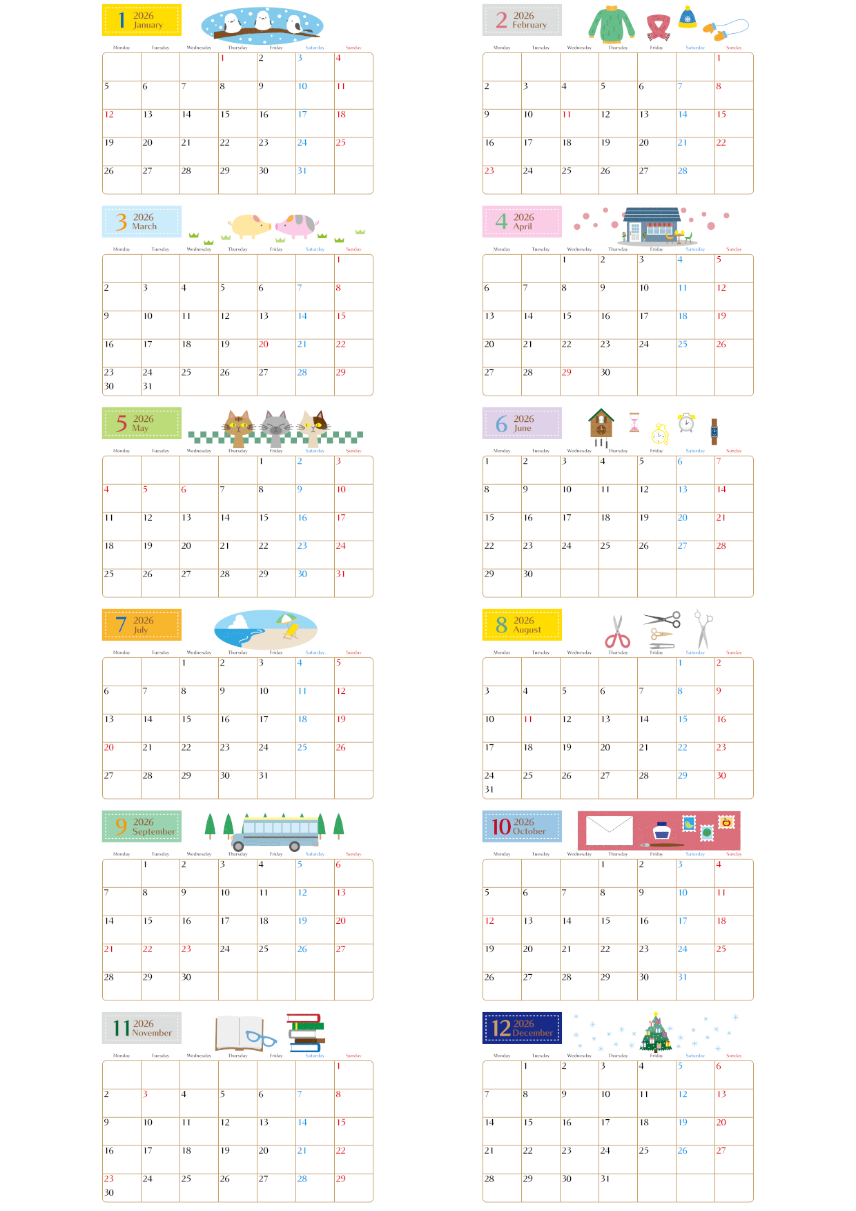 シンプルながらも大人っぽい雰囲気でまとめられた実用性の高い年間カレンダーです。A4横型で月曜始まりのレイアウトは、ビジネス手帳や学校のスケジュール管理と合わせやすく、一年間の予定を見渡すのにとても便利。飽きのこないおしゃれなデザインは、デスク周りを落ち着いた空気に整えたい方にぴったりです。余計な装飾を省いて視認性を高めているため、プライベートでも仕事でも快適に使えます。無料でダウンロードしてすぐに活用できます。