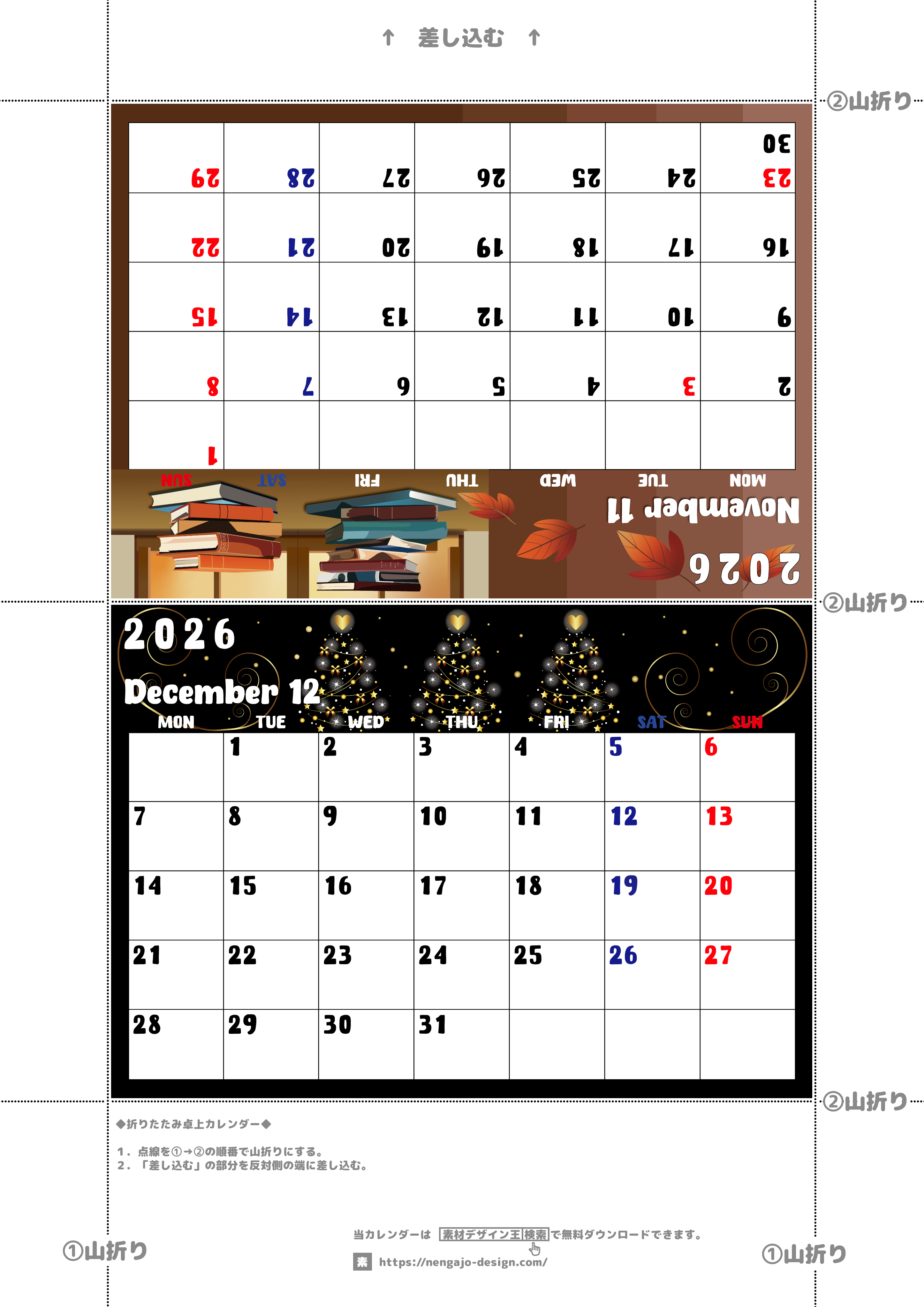 2026年の卓上カレンダー(11月・12月)は月曜始まり♪かわいいので予定の書き込みが楽しくなる♪無料/A4サイズ(2026-002211-1231)