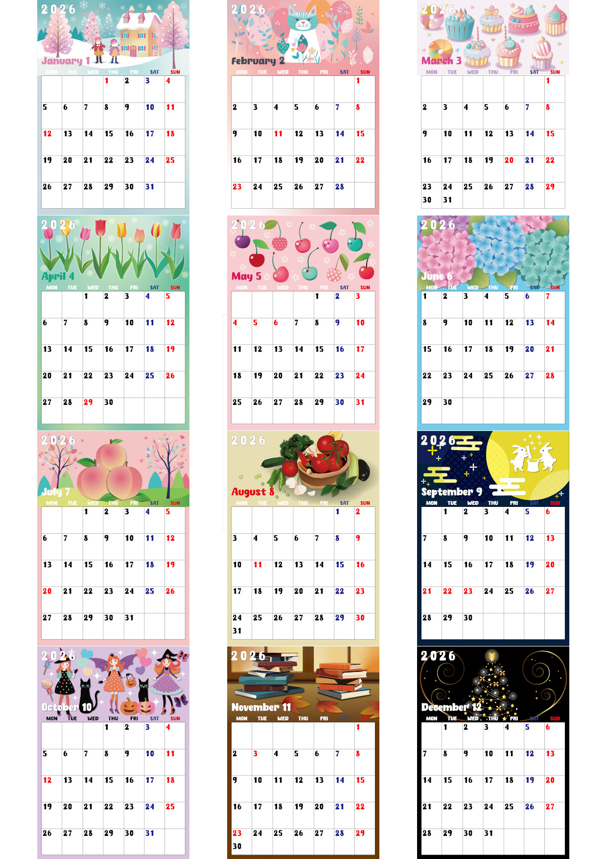 ワクワクする気持ちを一年中キープできそうな、カラフルでおしゃれなデザインの年間カレンダーです。A4縦型で月曜始まりの構成は、予定を整理する際の視線の流れが自然で使いやすく、学習計画や仕事のスケジュール管理にも役立ちます。カラーのメリハリによって情報が読み取りやすく、すっきりと整ったレイアウトで長期計画にも向いています。生活空間の雰囲気も明るくなる、無料ダウンロードがうれしい素材です。