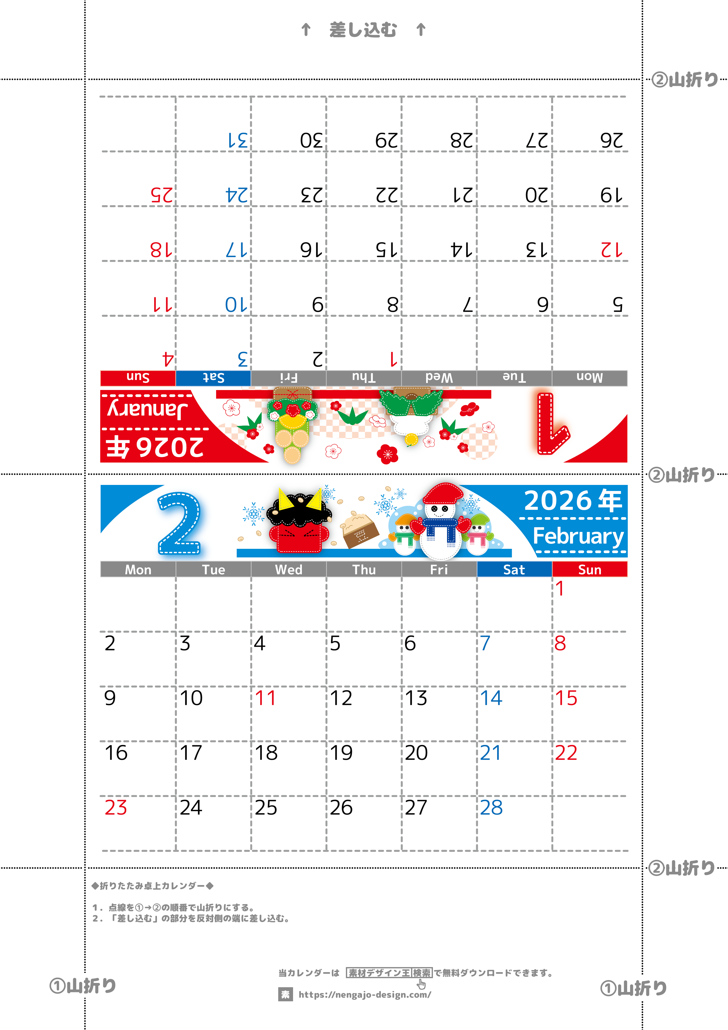 2026年の卓上カレンダー(1月・2月)は月曜始まり♪ポップで文字も大きめで見やすい♪無料でA4プリント♪(2026-002301-0231)