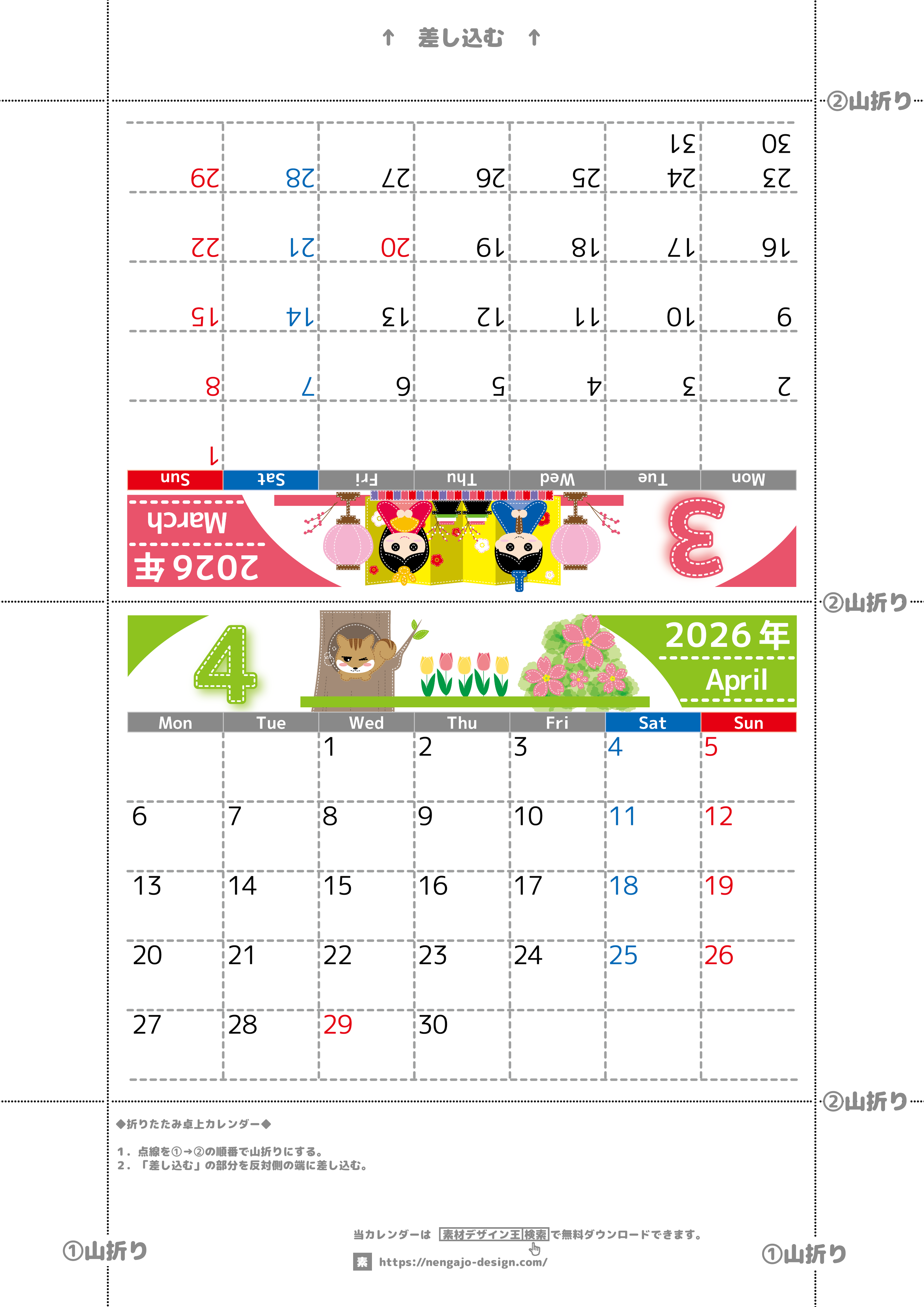 2026年・無料のカレンダーテンプレート 2026年の卓上カレンダー(3月・4月)は月曜始まり♪ポップで文字も大きめで見やすい♪無料でA4プリント♪(2026-002303-0431) 素材状デザイン王 2025年4月14日 2026年の卓上カレンダー(3月・4月)は月曜始まり♪ポップで文字も大きめで見やすい♪無料でA4プリント♪(2026-002303-0431) ポップ カレンダーデザイン-0023 3月 4月 パッチワーク 月曜始まり 卓上