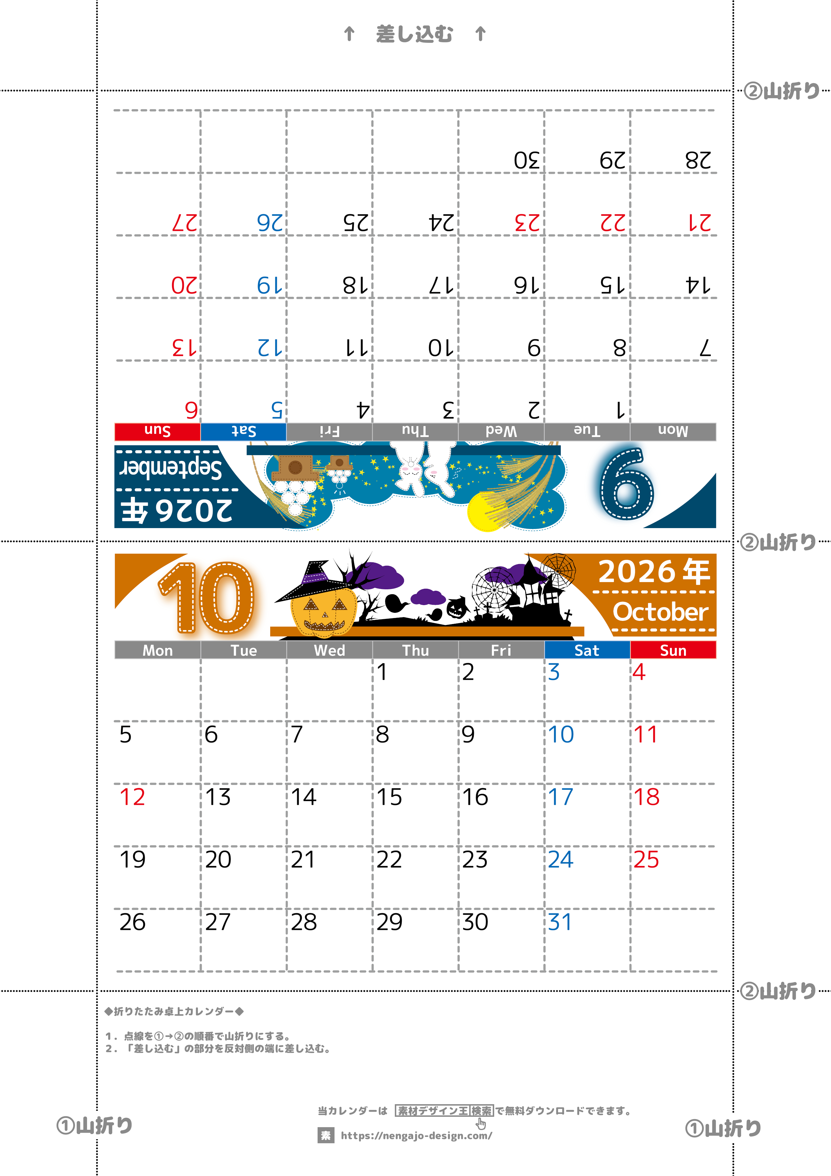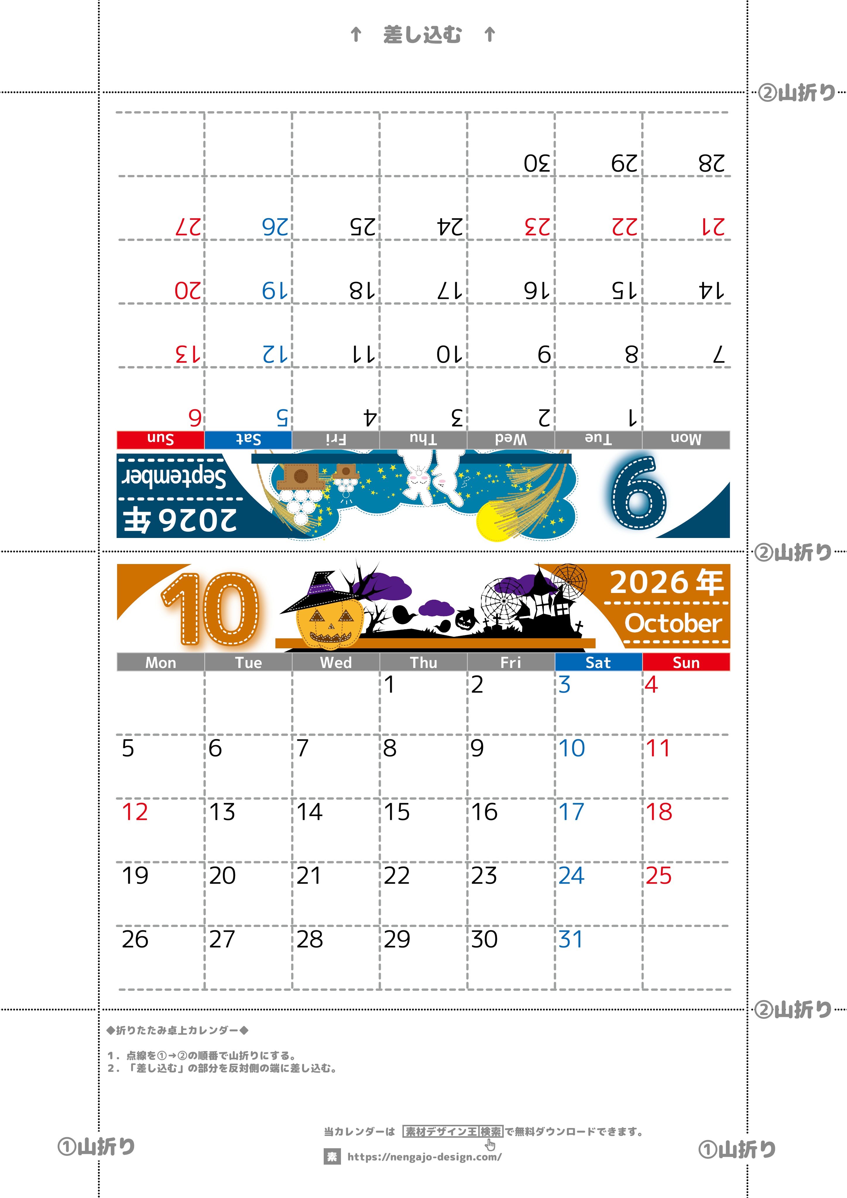 2026年・無料のカレンダーテンプレート 2026年の卓上カレンダー(9月・10月)は月曜始まり♪ポップで文字も大きめで見やすい♪無料でA4プリント♪(2026-002309-1031) 素材状デザイン王 2025年4月14日 2026年の卓上カレンダー(9月・10月)は月曜始まり♪ポップで文字も大きめで見やすい♪無料でA4プリント♪(2026-002309-1031) ポップ カレンダーデザイン-0023 9月 10月 パッチワーク 月曜始まり 卓上