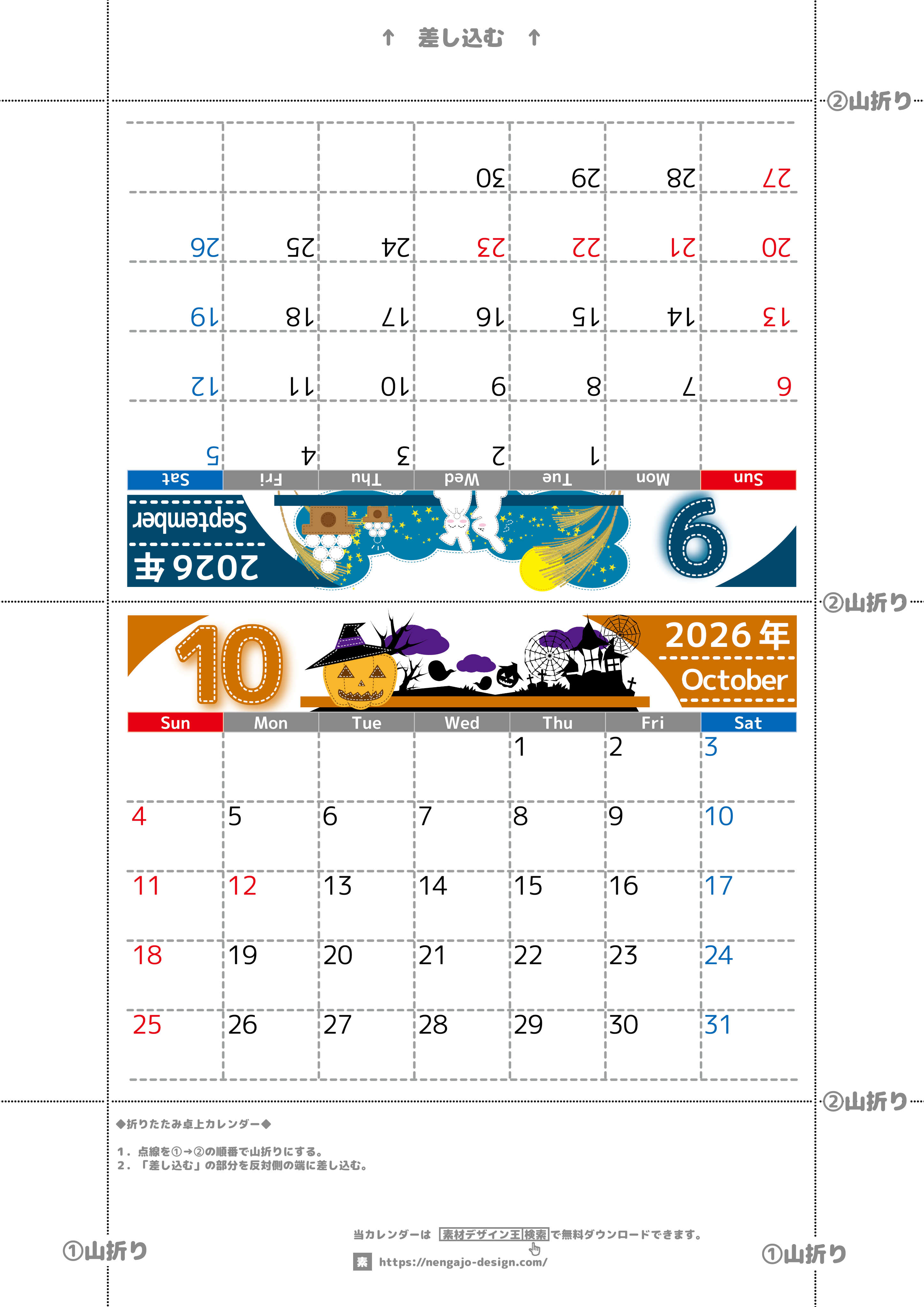2026年・無料のカレンダーテンプレート 2026年の卓上カレンダー(9月・10月)は日曜始まり♪ポップで文字も大きめで見やすい♪無料でA4プリント♪(2026-002309-1030) 素材状デザイン王 2025年4月14日 2026年の卓上カレンダー(9月・10月)は日曜始まりです。ポップなだけでなく文字も大きめなので卓上サイズでコンパクトですが見やすいです。無料ダウンロードしてプリント利用をしましょう。(2026-002309-1030) ポップ カレンダーデザイン-0023 9月 10月 パッチワーク 日曜始まり 卓上