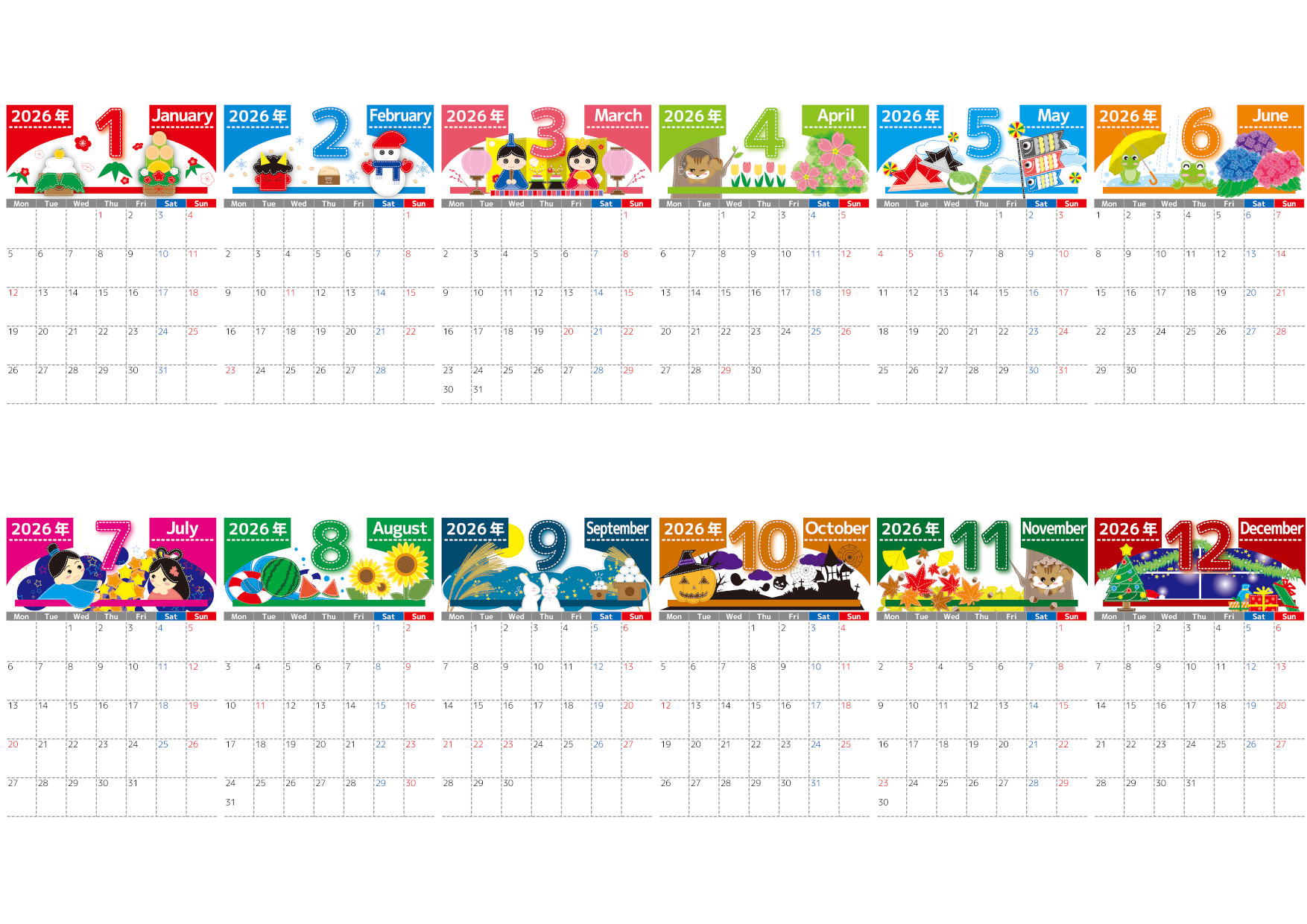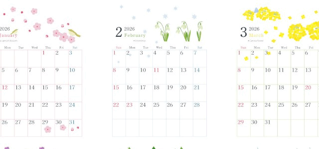 かわいらしいパッチワーク風のモチーフがアクセントになった年間カレンダーです。A4縦型で月曜始まりの構成は、スケジュールの流れが掴みやすく、年間の計画を視覚的に整理できる実用性を備えています。カラフルで明るい雰囲気のイラストが毎日の予定管理を楽しくしてくれ、壁に飾るだけで室内を華やかに彩ります。家族全員の予定表としても一人用としても幅広く活用しやすいデザインです。無料でダウンロードしてすぐ利用できます。