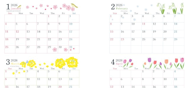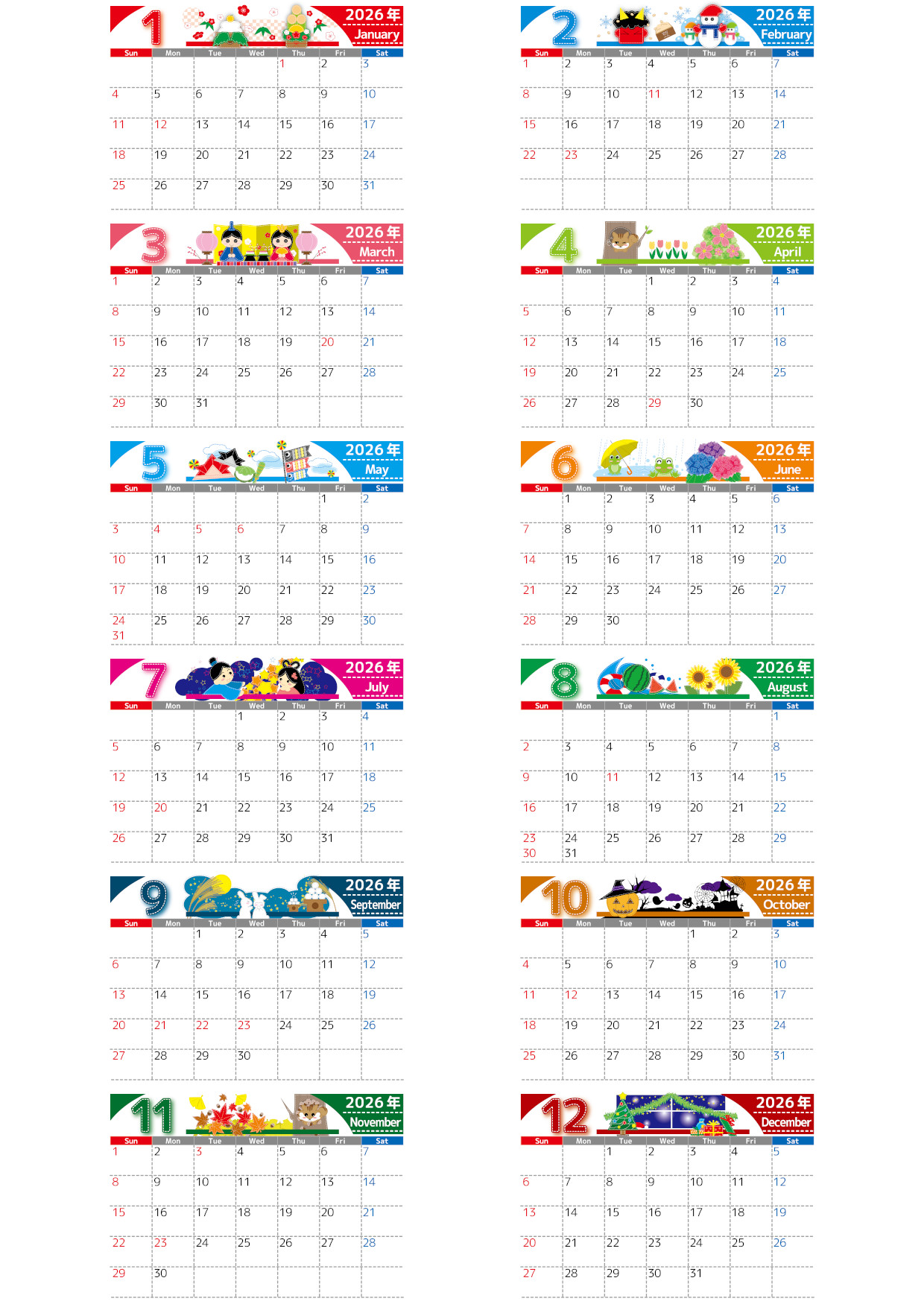 2026年間カレンダー♪A4横型の日曜始まりでパッチワーク風のかわいいデザイン!予定管理にぴったりの無料ダウンロード可能!