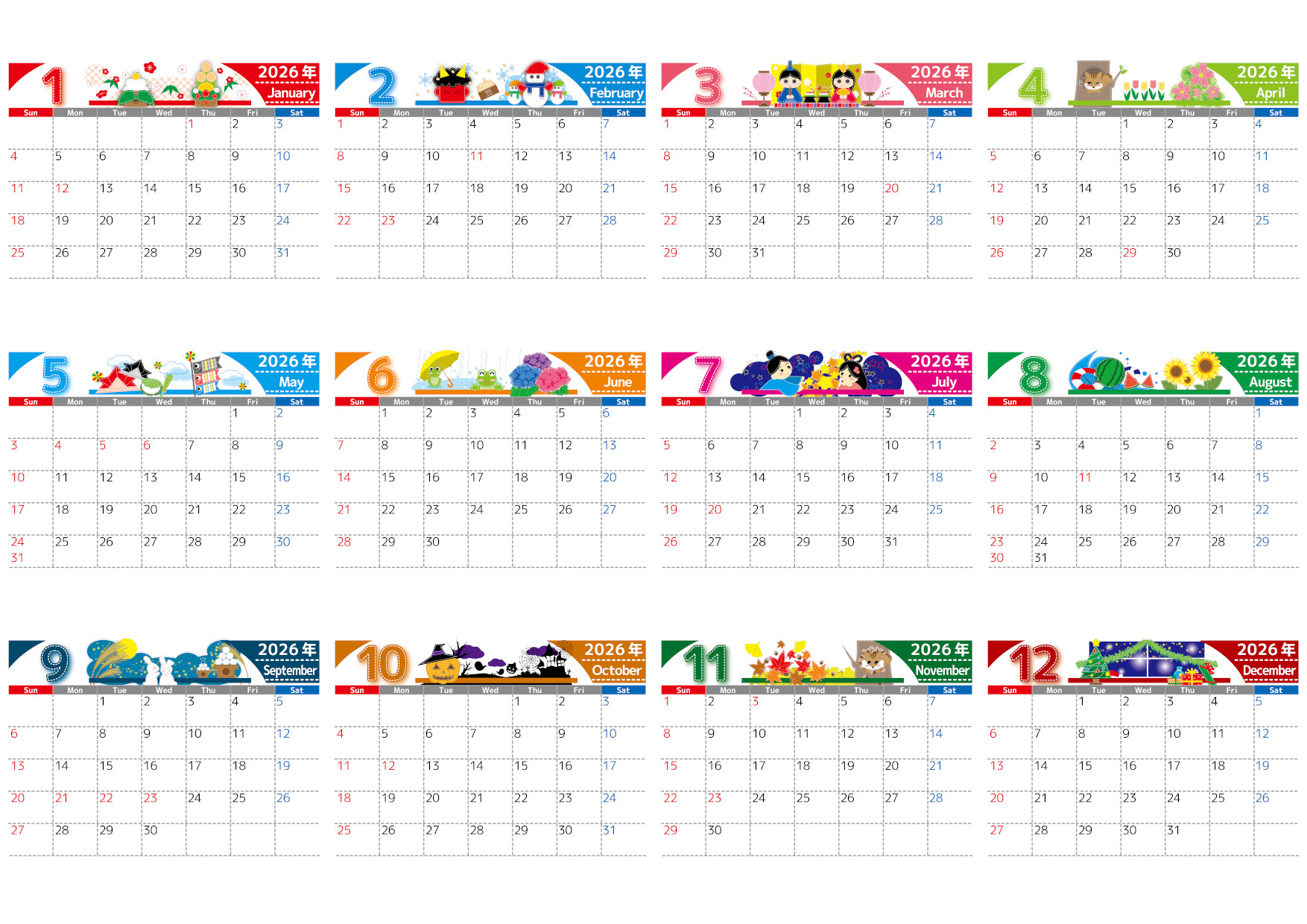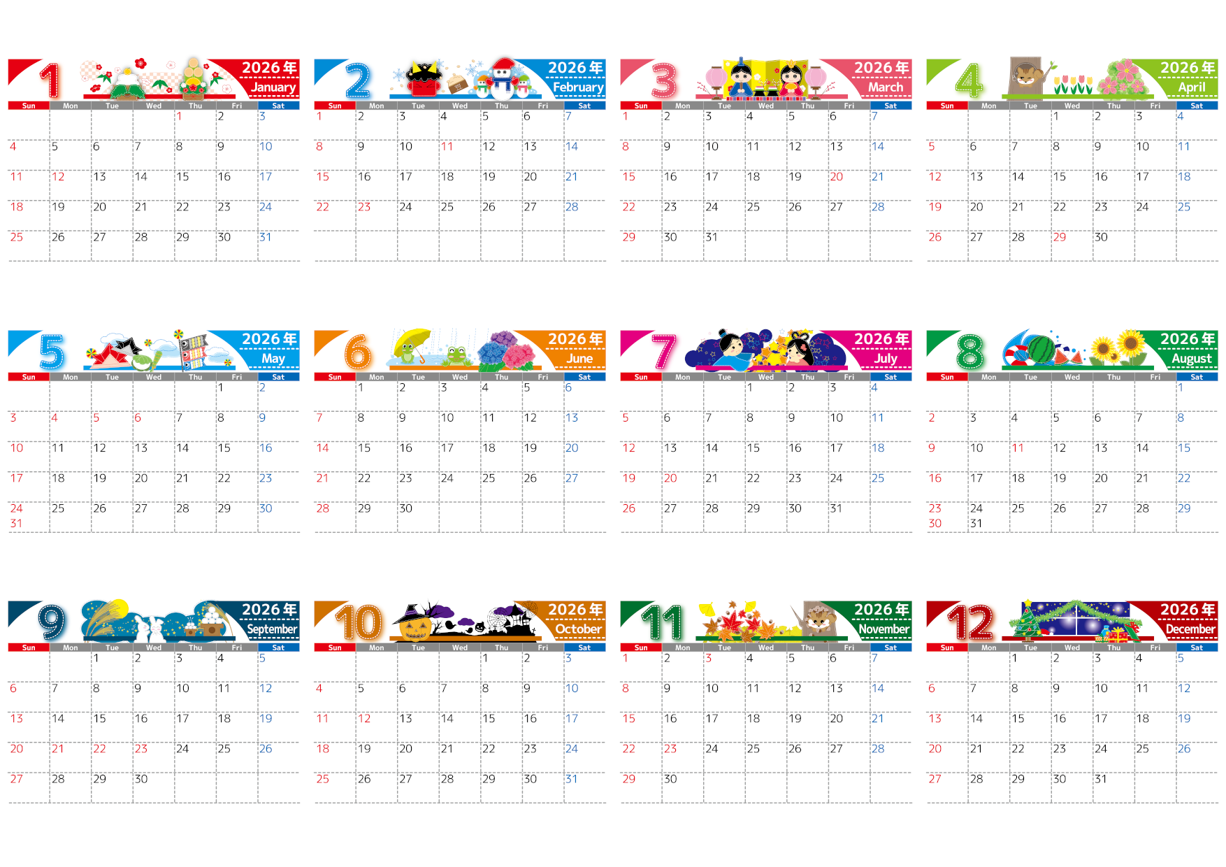 スケジュール整理が快適に進む実用性重視の年間カレンダーです。A4横向きの日曜始まりで書き込みスペースがしっかり確保されており、イベント管理や家族の予定共有にもぴったり。直感的に見やすいレイアウトで必要な情報をすぐにチェックできる構成です。シンプルでありながら温かみのあるデザインで毎日の生活に自然と馴染みます。無料ダウンロードで使えるフリー素材として気軽に取り入れられます。