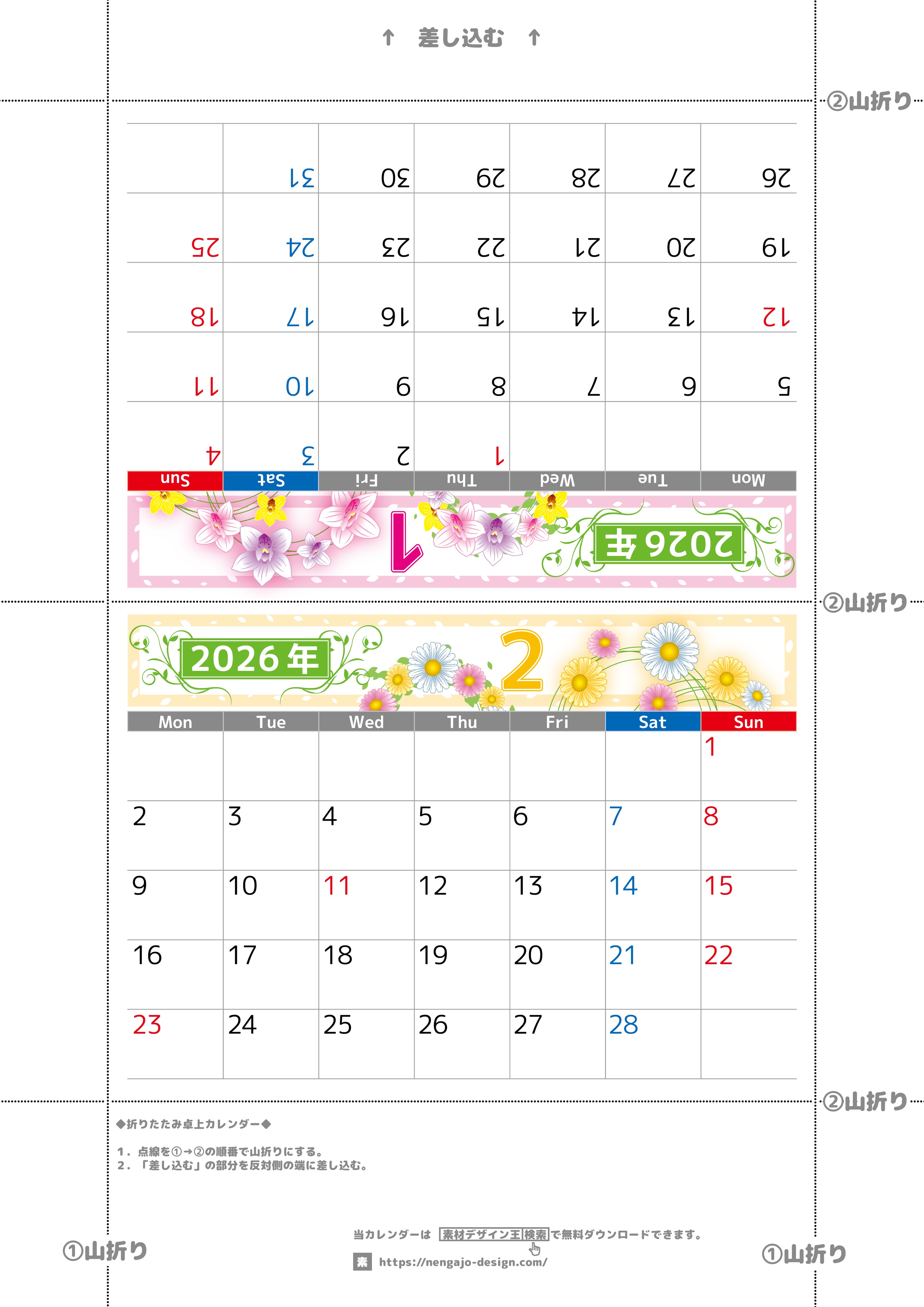 2026年・無料のカレンダーテンプレート 2026年の卓上カレンダー(1月・2月)は月曜始まり♪おしゃれなので予定の書き込みが楽しくなる♪無料/A4サイズ(2026-002401-0231) 素材状デザイン王 2025年4月14日 2026年の卓上カレンダー(1月・2月)は月曜始まり♪おしゃれなので予定の書き込みが楽しくなる♪無料/A4サイズ(2026-002401-0231) おしゃれ カレンダーデザイン-0024 1月 2月 草花 月曜始まり 卓上