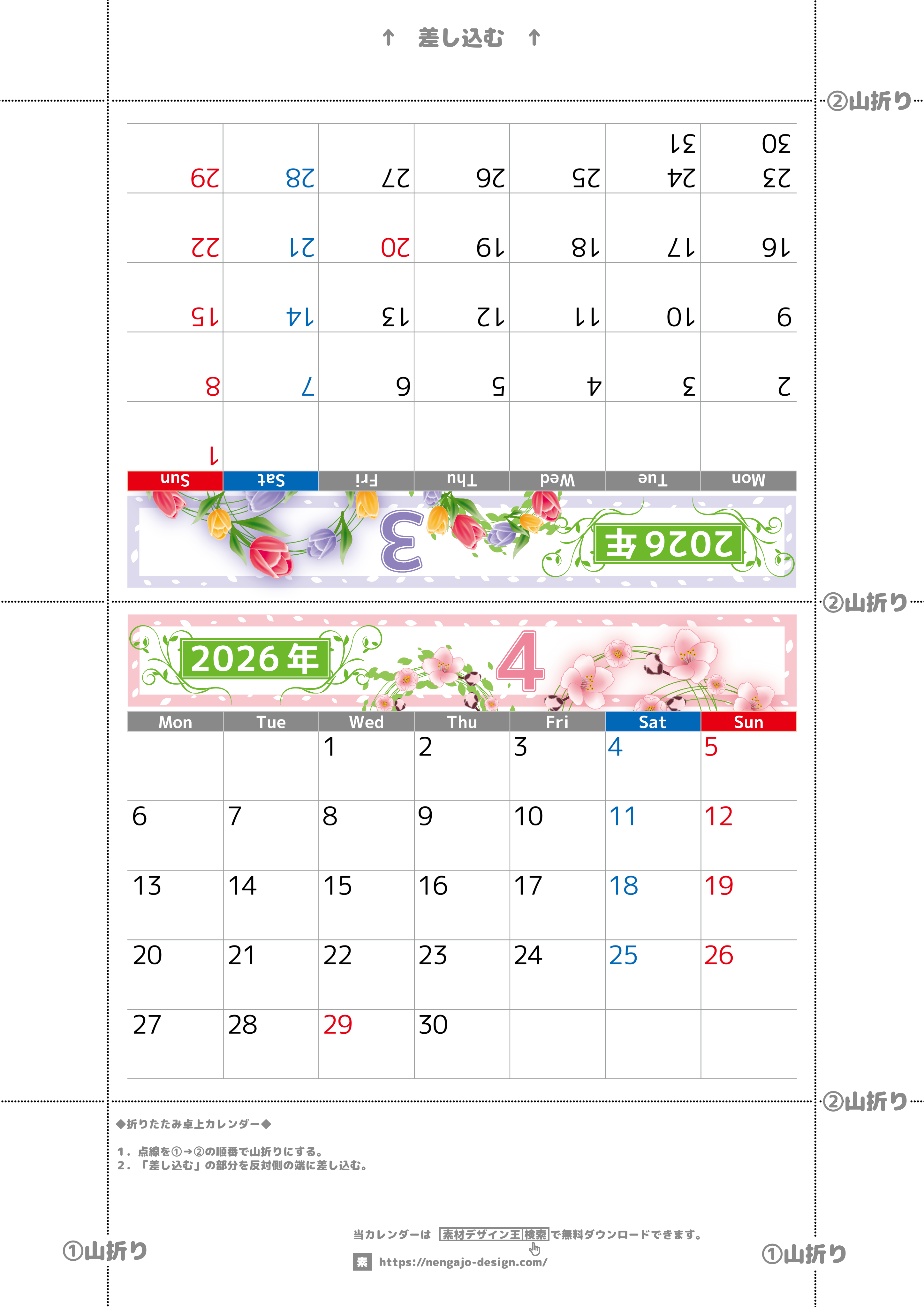 2026年・無料のカレンダーテンプレート 2026年の卓上カレンダー(3月・4月)は月曜始まり♪おしゃれなので予定の書き込みが楽しくなる♪無料/A4サイズ(2026-002403-0431) 素材状デザイン王 2025年4月14日 2026年の卓上カレンダー(3月・4月)は月曜始まり♪おしゃれなので予定の書き込みが楽しくなる♪無料/A4サイズ(2026-002403-0431) おしゃれ カレンダーデザイン-0024 3月 4月 草花 月曜始まり 卓上