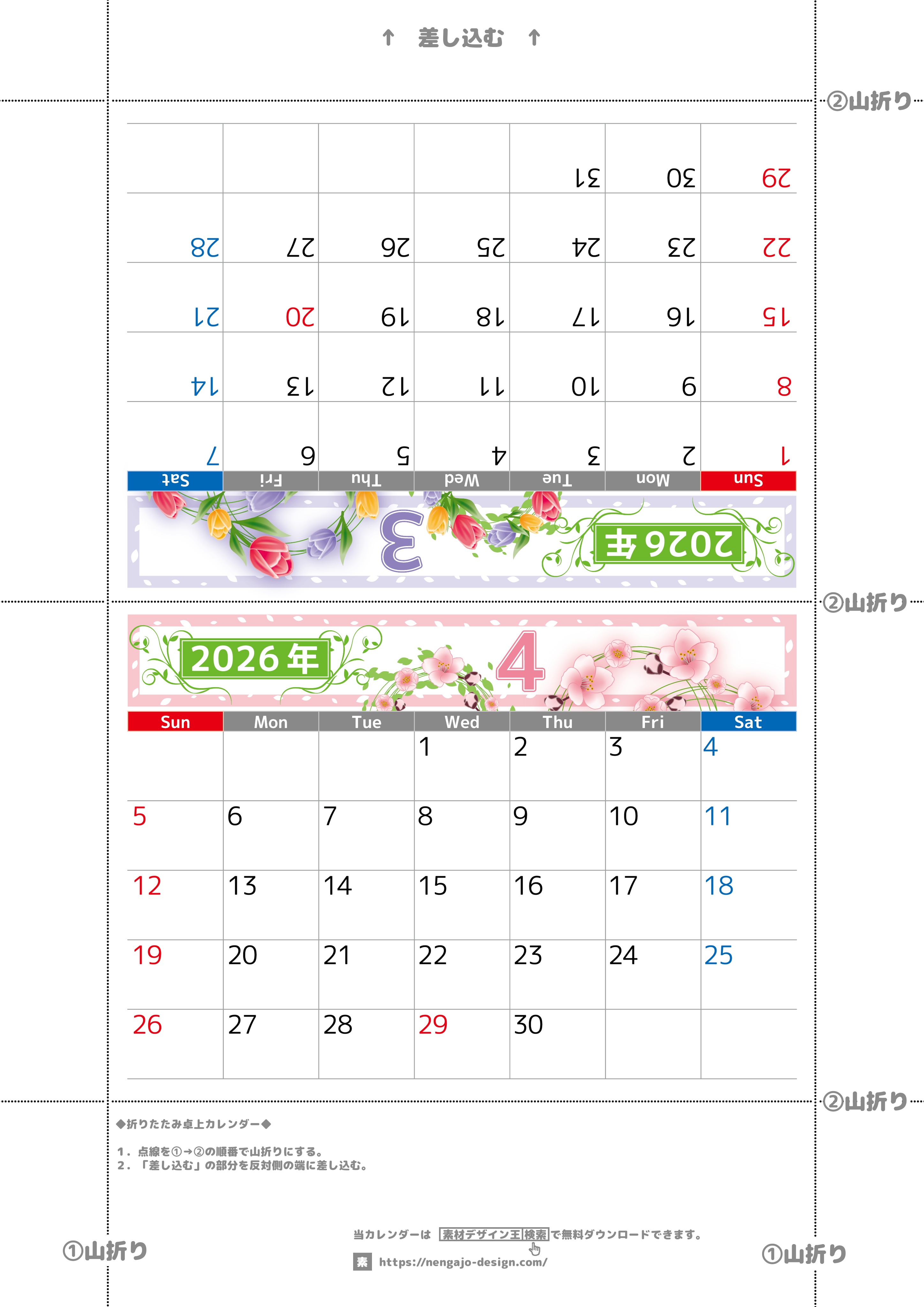 2026年・無料のカレンダーテンプレート 2026年の卓上カレンダー(3月・4月)は日曜始まり♪おしゃれなので予定の書き込みが楽しくなる♪無料/A4サイズ(2026-002403-0430) 素材状デザイン王 2025年4月14日 2026年の卓上カレンダー(3月・4月)は日曜始まりです。おしゃれなので予定の書き込みが楽しくなって計画を立てるモチベーションも維持できます。無料でサイズはA4です。(2026-002403-0430) おしゃれ カレンダーデザイン-0024 3月 4月 草花 日曜始まり 卓上