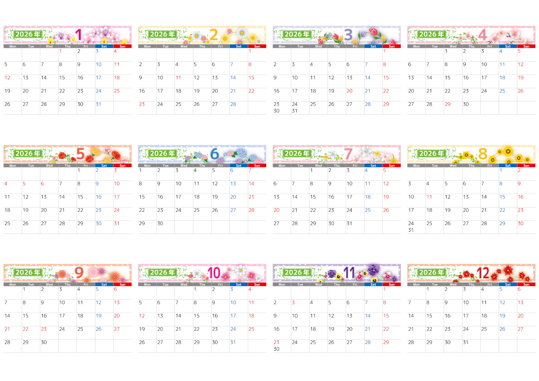 上品さと実用性を兼ね備えた年間カレンダーです。A4横型で月曜始まりのレイアウトは、長期的なスケジュール管理を整理しやすく、必要な情報を見失わない整った配置になっています。花をテーマにした柔らかなデザインで、部屋をやさしい雰囲気に彩りながら、年間を通じて使いやすい仕上がりです。ビジネスでも家庭でも気軽に取り入れられる汎用性の高さが魅力で、無料ダウンロードで利用できます。