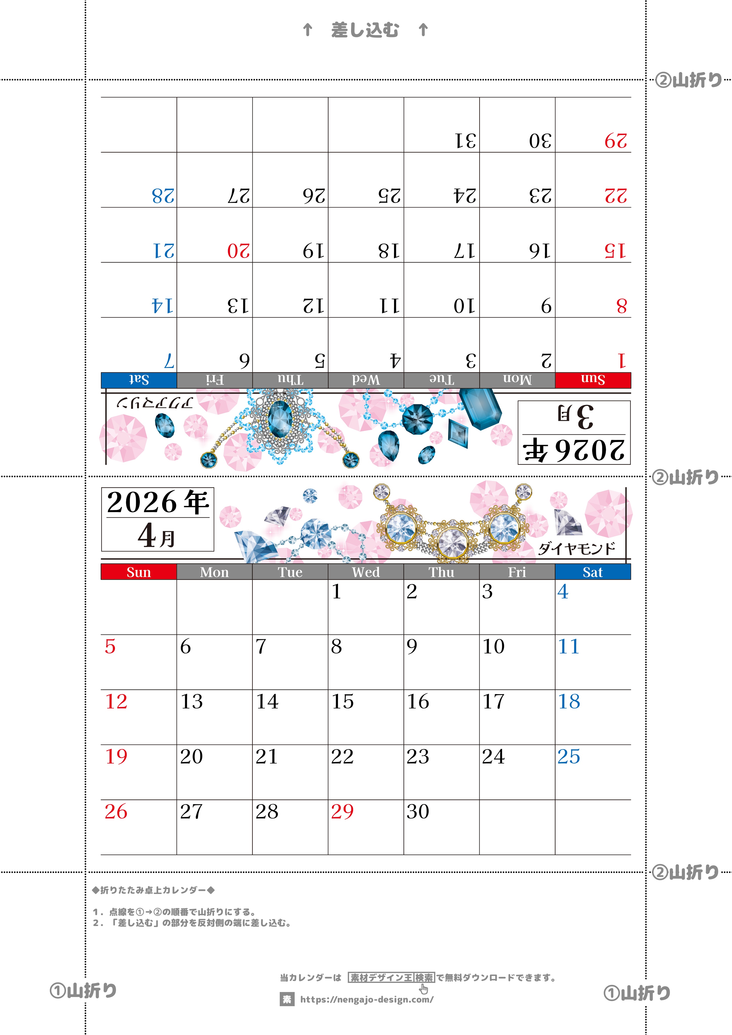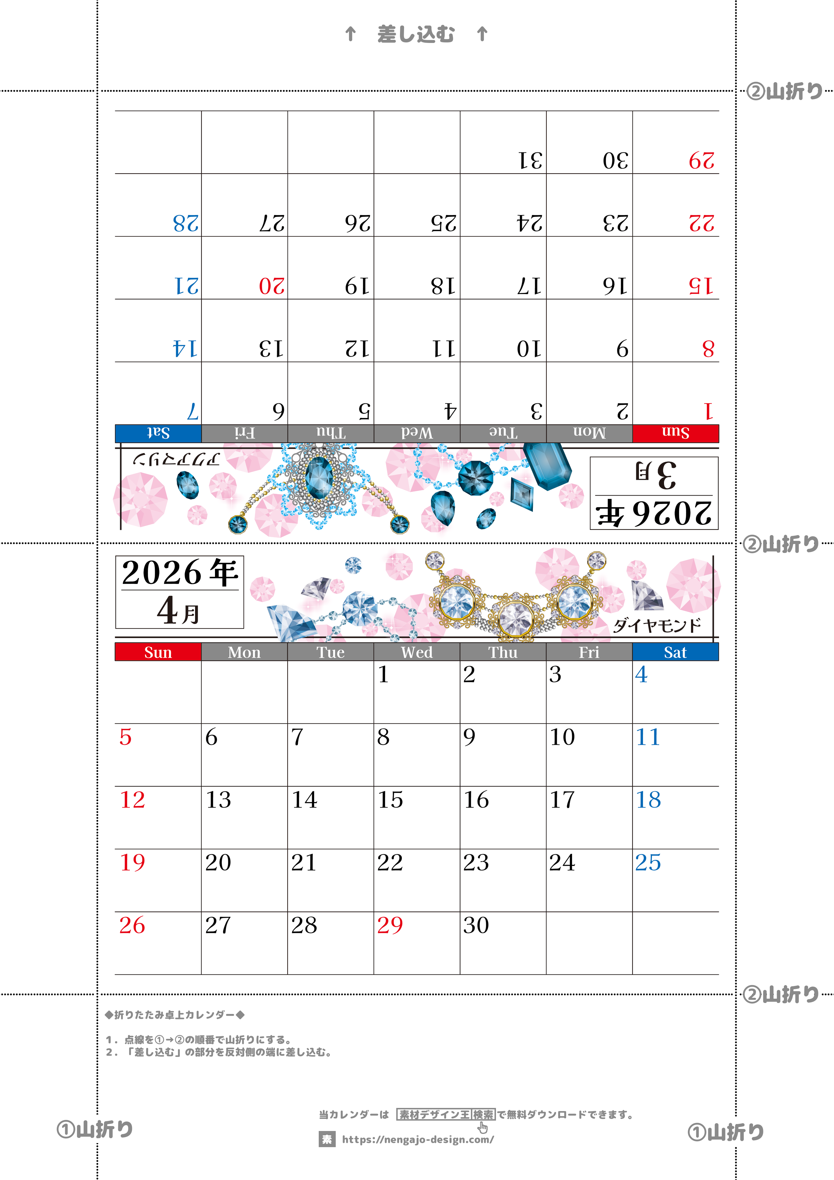 2026年の卓上カレンダー(3月・4月)は日曜始まりです。おしゃれで作り方も簡単でサクッとらくちんです。A4サイズの無料素材となっていますのでダウンロードも気軽に行えます。(2026-002503-0430)