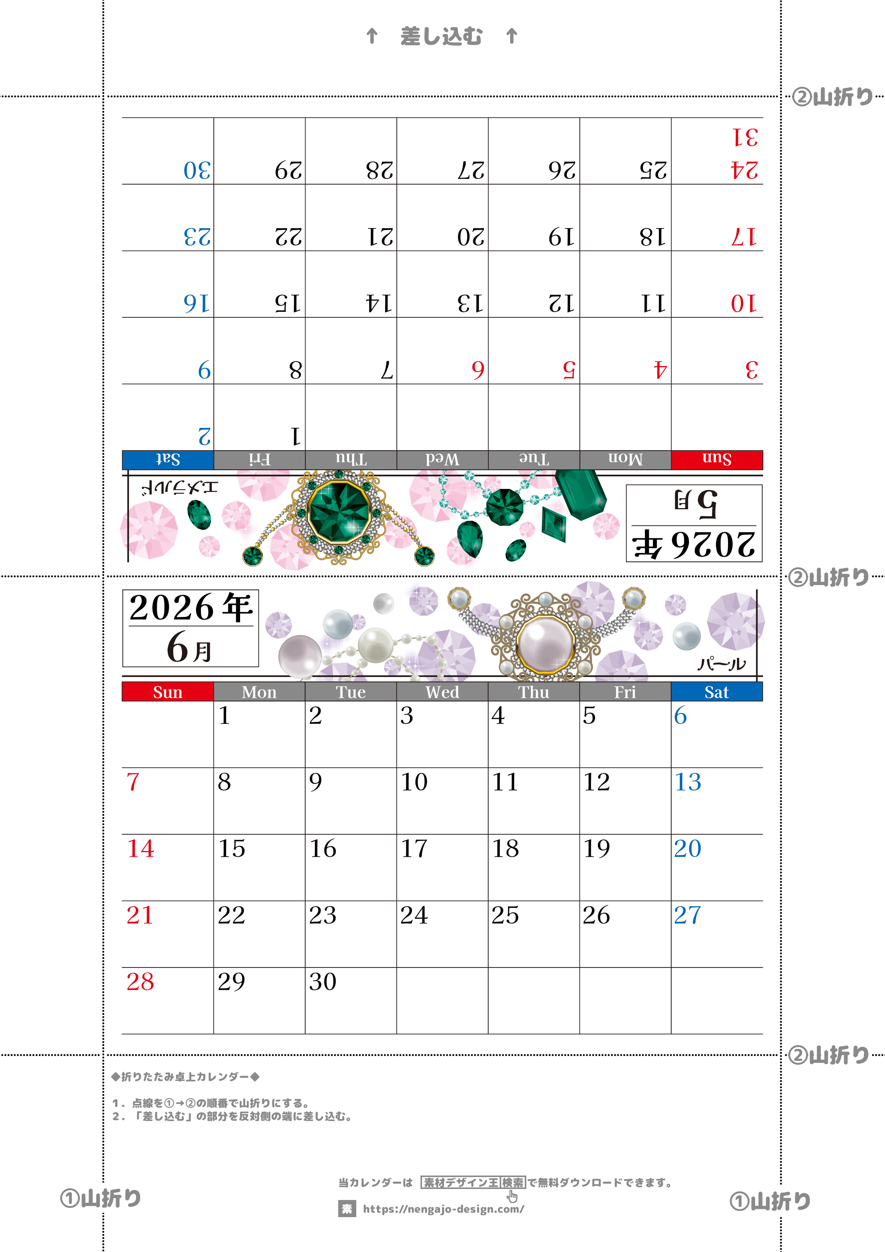 2026年の卓上カレンダー(5月・6月)は日曜始まり♪おしゃれで作り方も簡単サクッとらくちん♪A4サイズの無料素材♪(2026-002505-0630)
