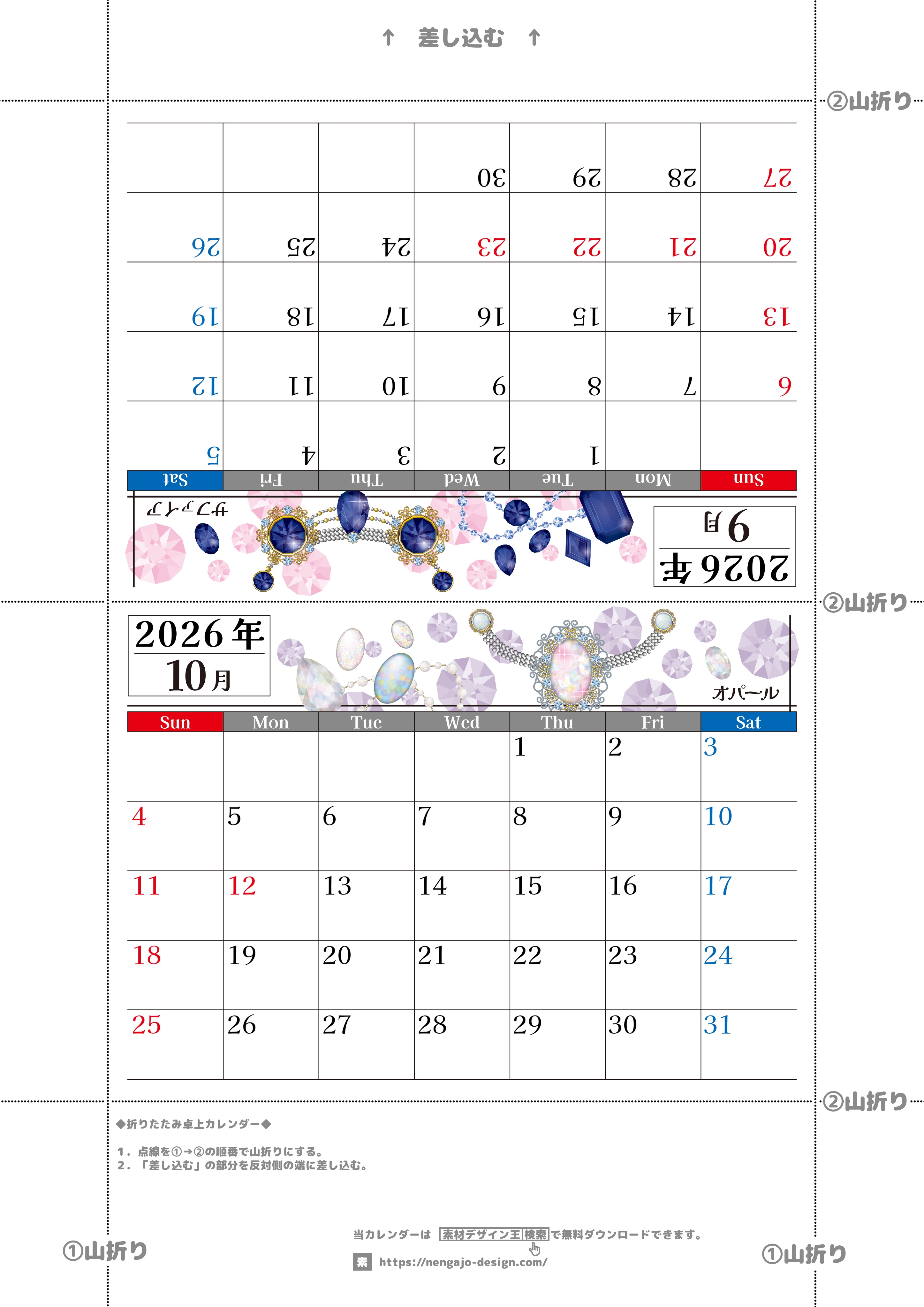 2026年・無料のカレンダーテンプレート 2026年の卓上カレンダー(9月・10月)は日曜始まり♪おしゃれで作り方も簡単サクッとらくちん♪A4サイズの無料素材♪(2026-002509-1030) 素材状デザイン王 2025年4月14日 2025.12.30 2026年の卓上カレンダー(9月・10月)は日曜始まりです。おしゃれで作り方も簡単でサクッとらくちんです。A4サイズの無料素材となっていますのでダウンロードも気軽に行えます。(2026-002509-1030) おしゃれ カレンダーデザイン-0025 9月 10月 誕生石・宝石 日曜始まり 卓上
