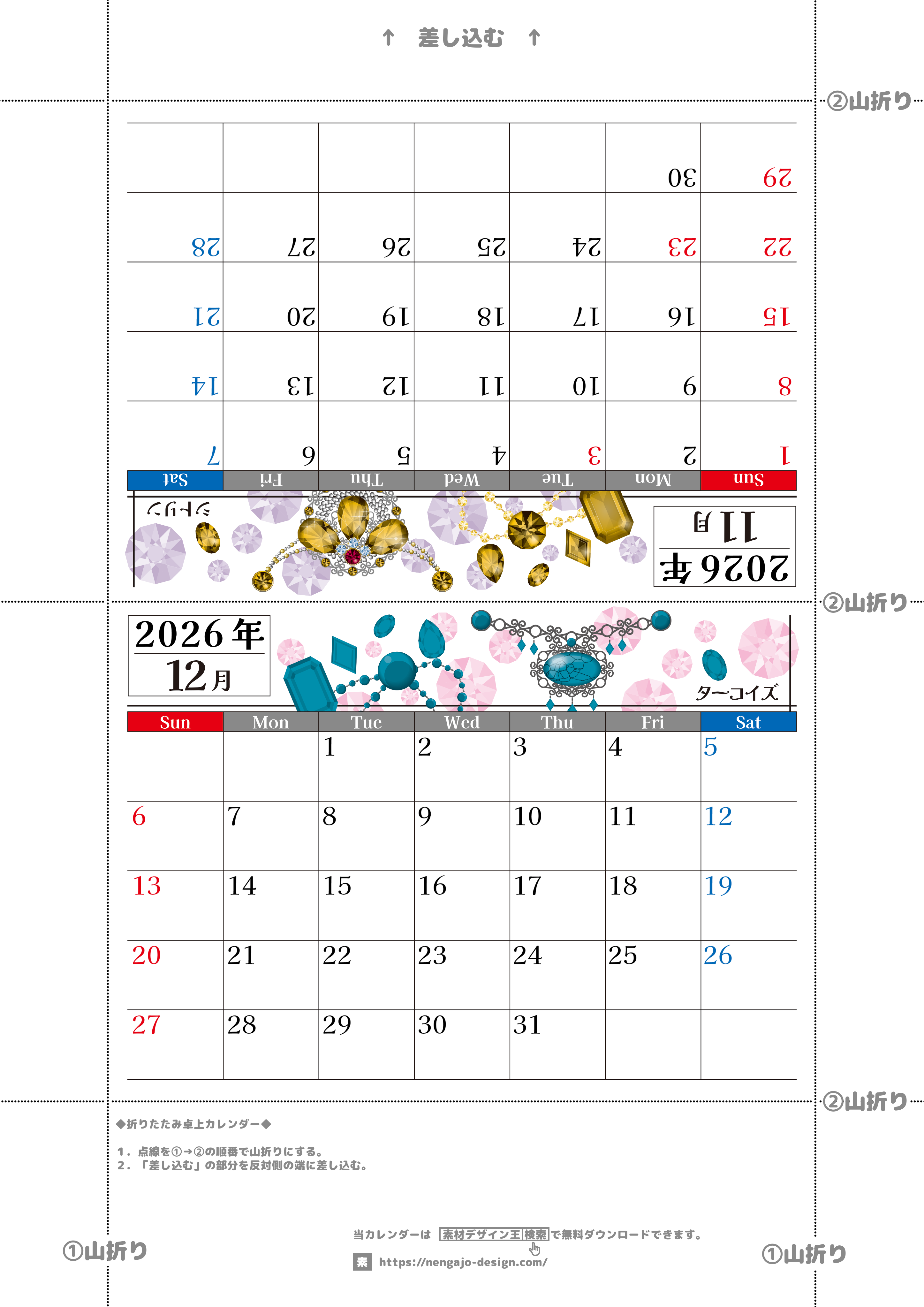 2026年の卓上カレンダー(11月・12月)は日曜始まりです。おしゃれで作り方も簡単でサクッとらくちんです。A4サイズの無料素材となっていますのでダウンロードも気軽に行えます。(2026-002511-1230)