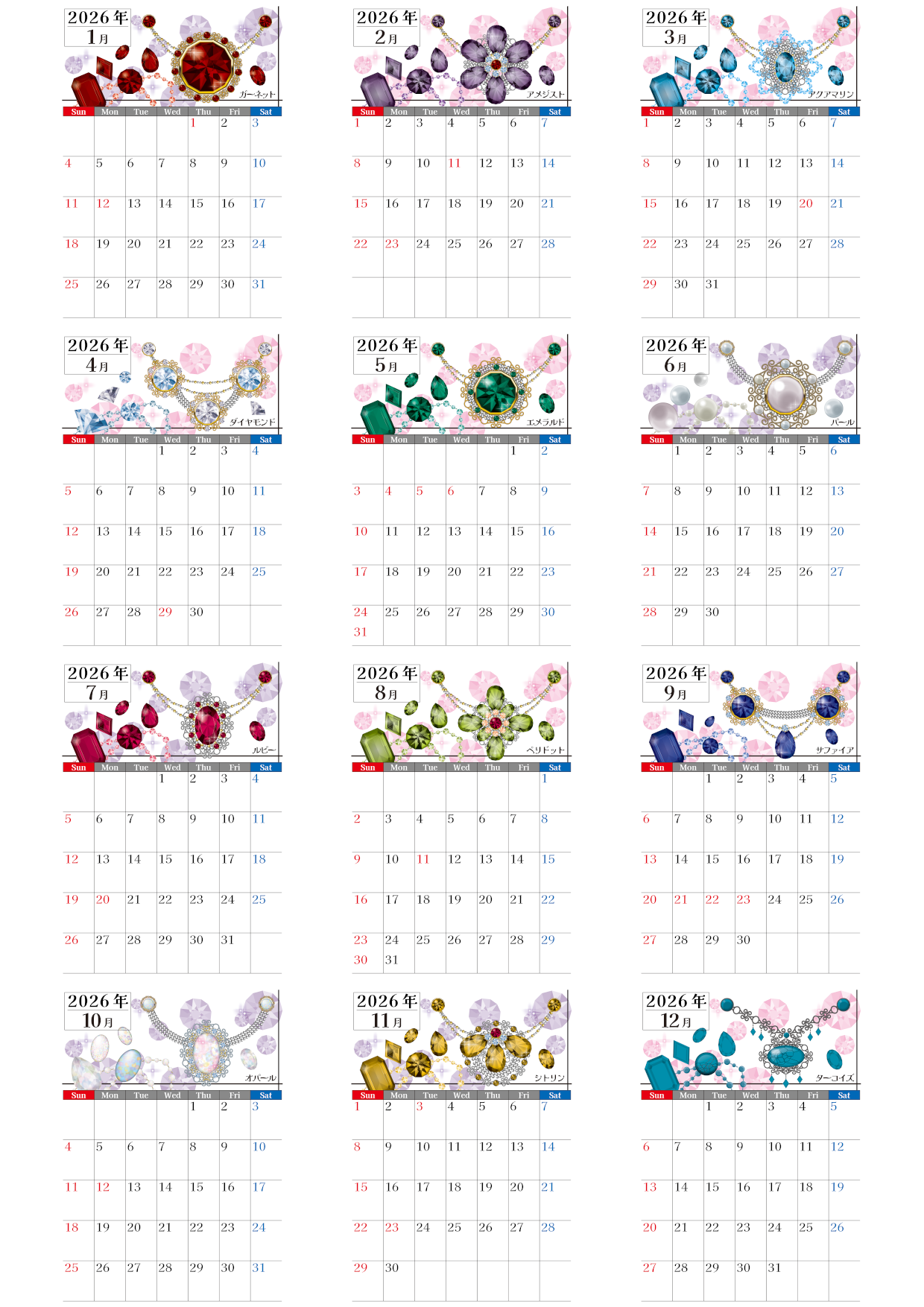 女性に嬉しい誕生石モチーフの年間カレンダーです。A4縦型で日曜始まりの構成は壁掛けにした際の視認性も高く、家族の予定やイベント管理に便利。やわらかい雰囲気のデザインは落ち着いた空間にも馴染みやすく、毎日眺めていたくなるかわいらしさがあります。無料でダウンロードしてすぐに使えます。