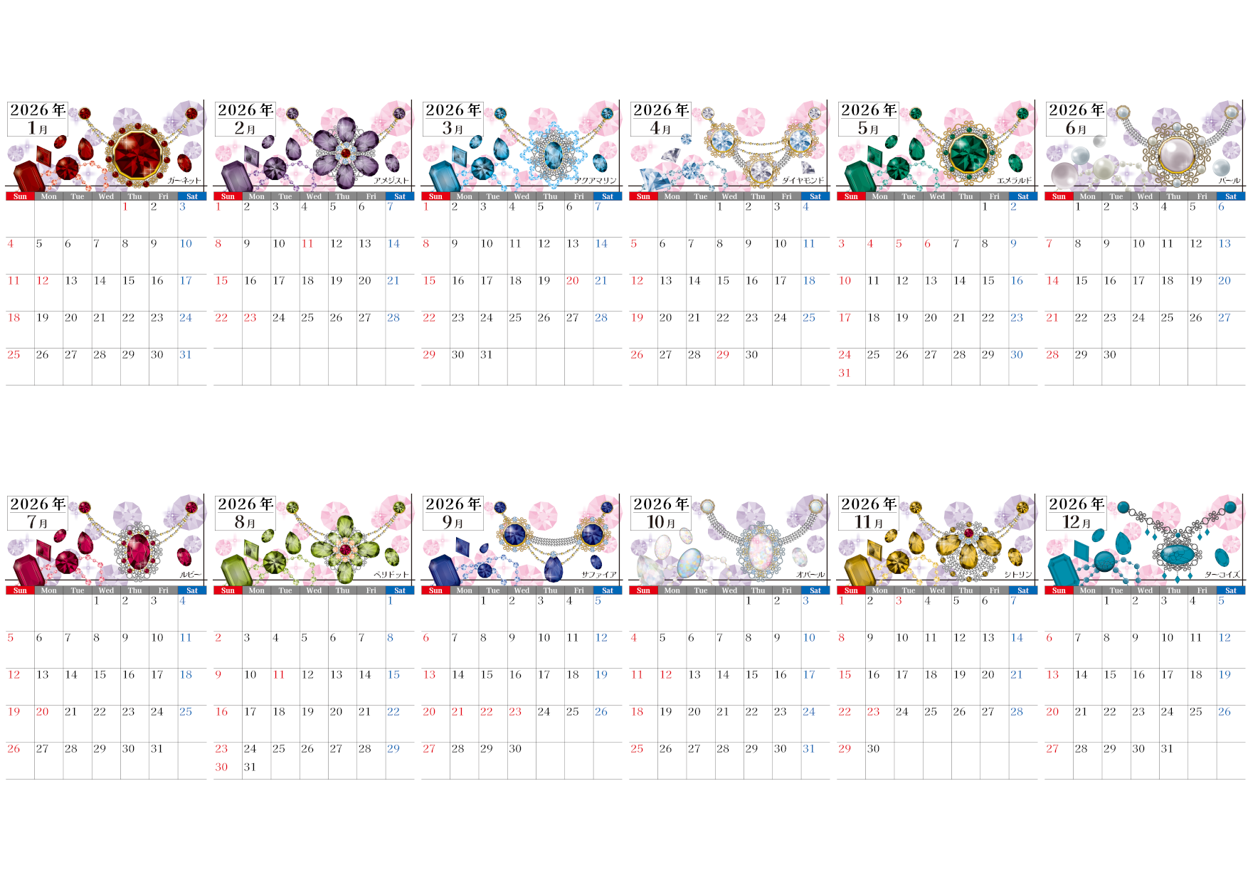 A4縦型で使える2026年間カレンダー♪日曜始まりでジュエリーの輝きがきれい!無料ダウンロードできます!