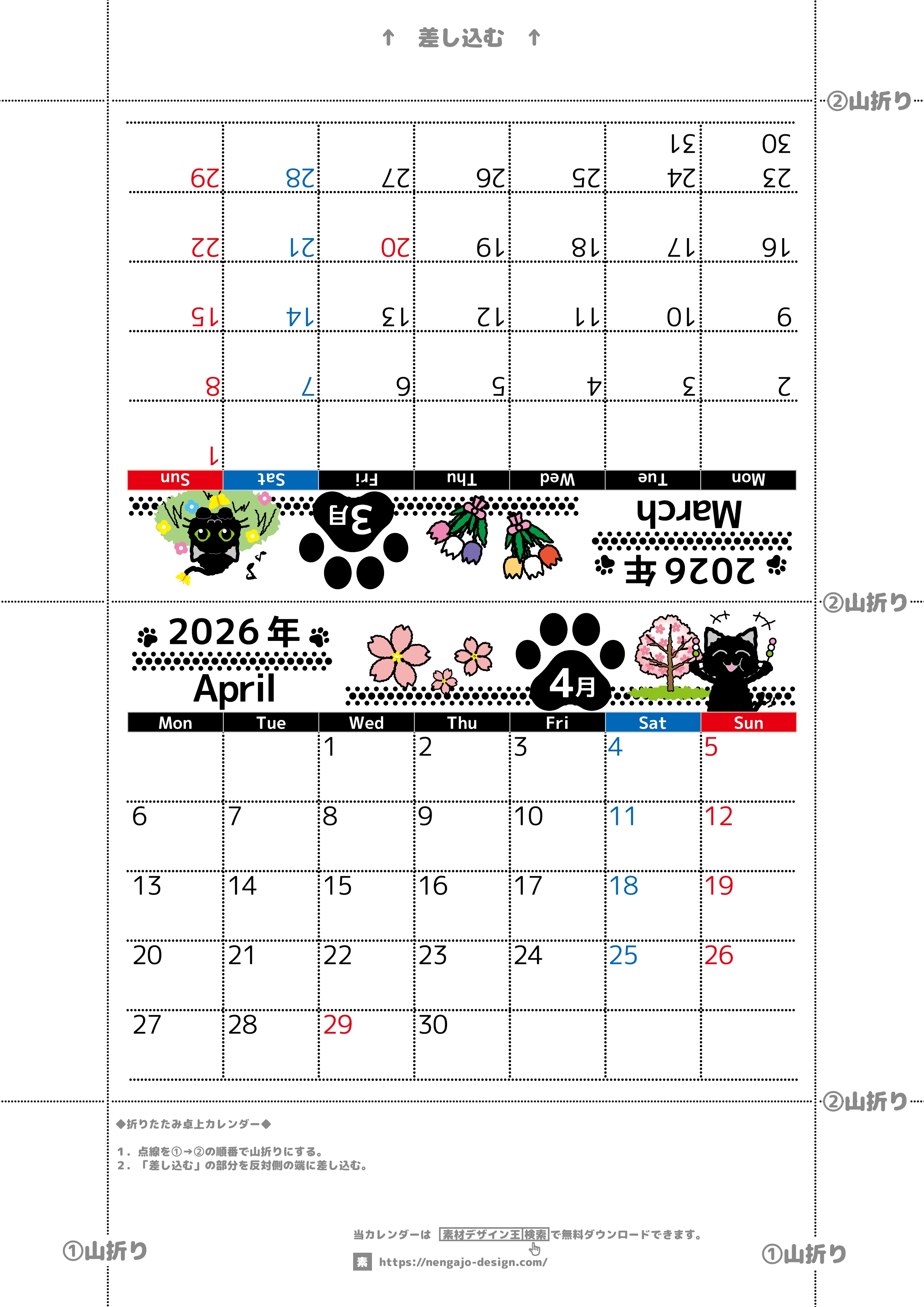 2026年・無料のカレンダーテンプレート 2026年の卓上カレンダー(3月・4月)は月曜始まり♪黒猫がかわいいオリジナルイラスト♪猫好きさんにおすすめ♪(2026-002603-0431) 素材状デザイン王 2025年4月14日 2026年の卓上カレンダー(3月・4月)は月曜始まり♪黒猫がかわいいオリジナルイラスト♪猫好きさんにおすすめ♪(2026-002603-0431) かわいい カレンダーデザイン-0026 3月 4月 猫 月曜始まり 卓上