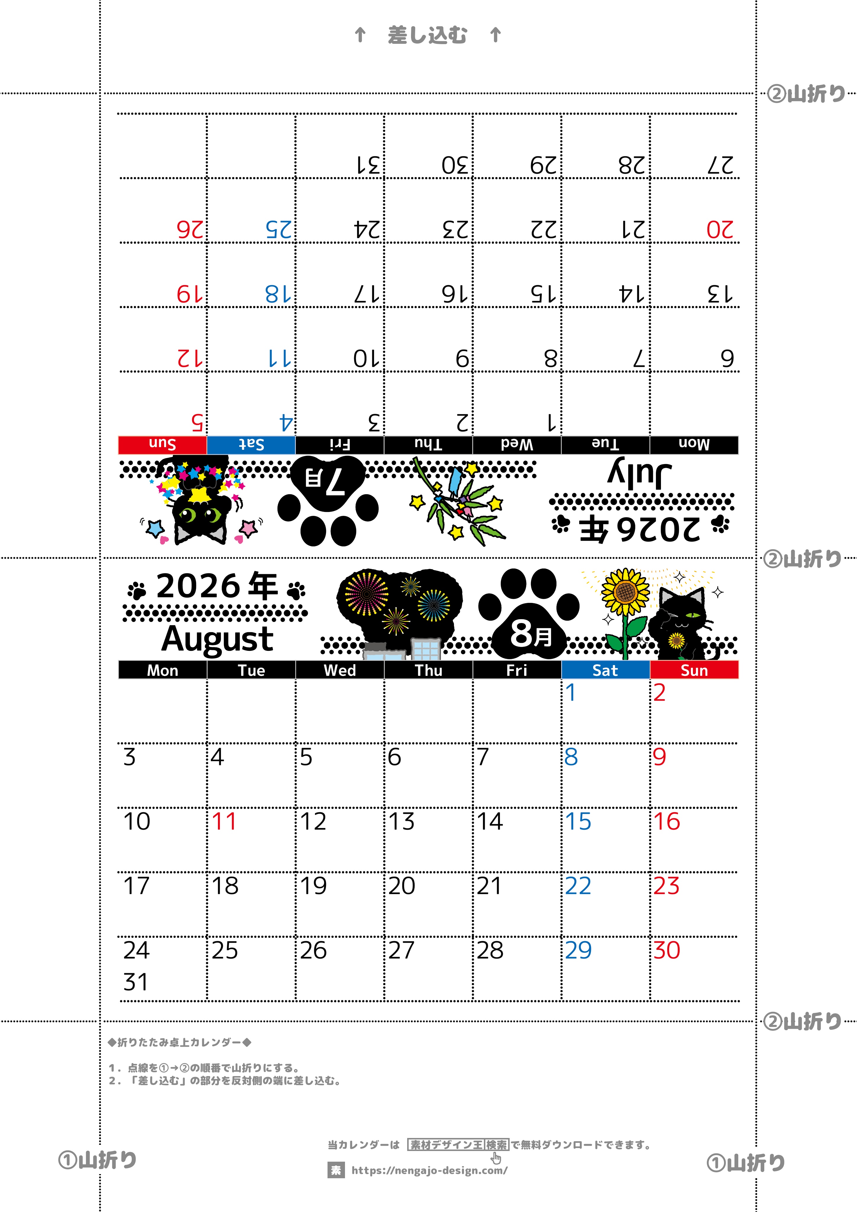 2026年の卓上カレンダー(7月・8月)は月曜始まり♪黒猫がかわいいオリジナルイラスト♪猫好きさんにおすすめ♪(2026-002607-0831)