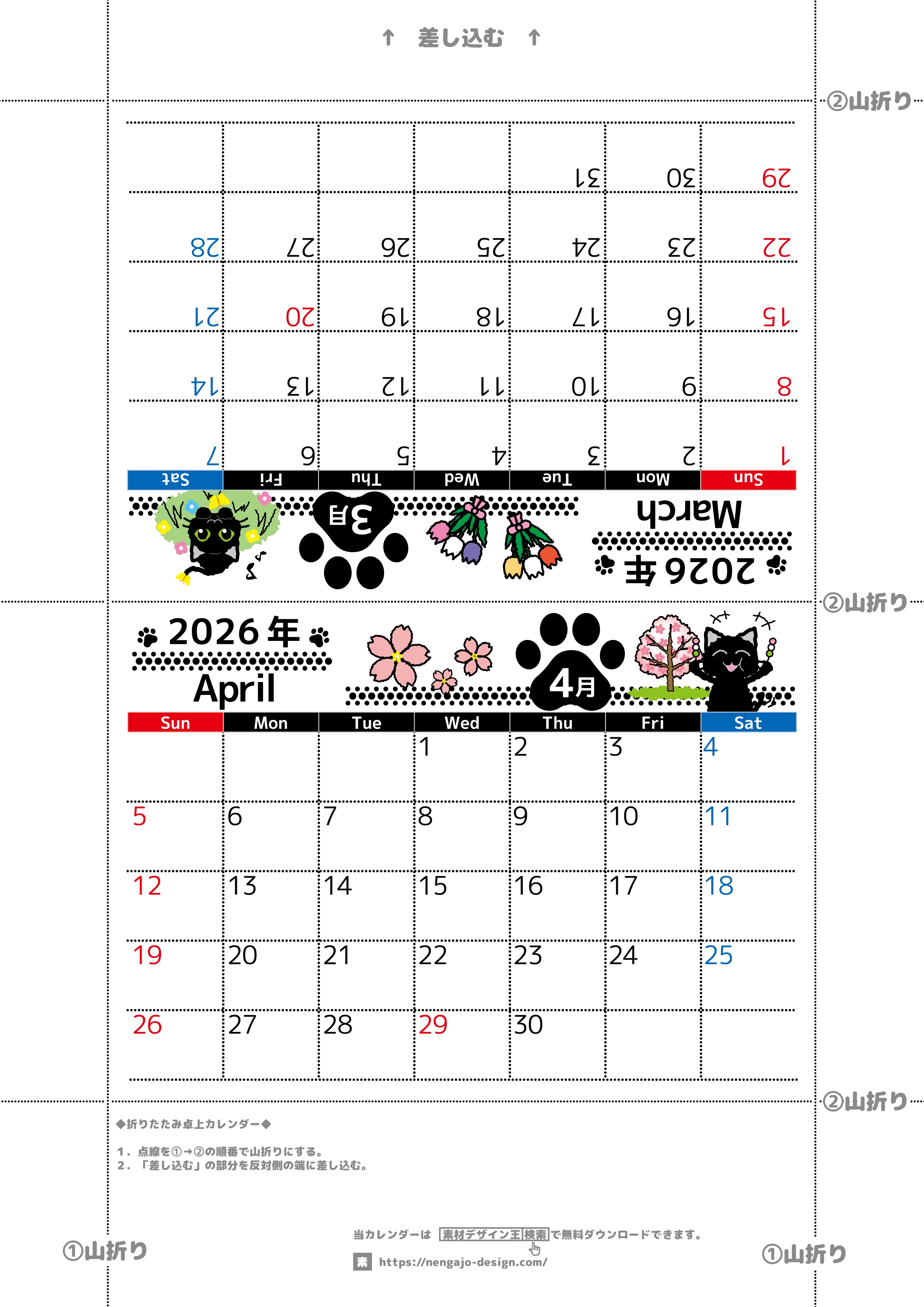 2026年の卓上カレンダー(3月・4月)は日曜始まりです。黒猫がかわいいオリジナルイラストです。猫好きさんに無料ダウンロードをおすすめします。(2026-002603-0430)