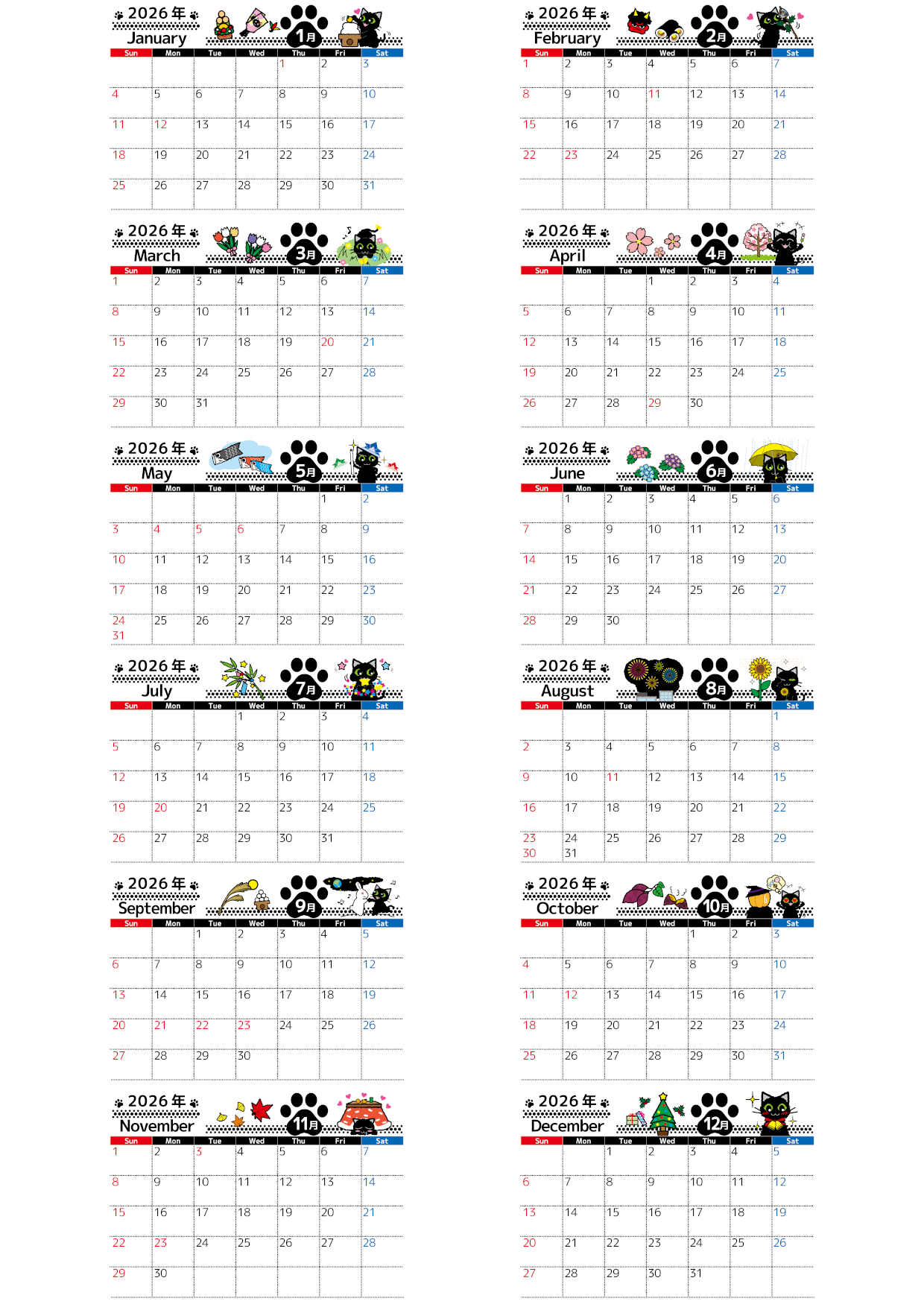 ふんわりと癒される黒猫イラストが印象的な年間カレンダーです。A4横型の日曜始まりで予定が一覧で見やすく、壁に貼ってもデスク横に置いても視認性が高いレイアウトになっています。かわいらしい表情の黒猫が毎日の予定管理を楽しくしてくれるデザインで、家族用や個人のスケジュール表としてもぴったり。年間の流れをひと目で確認できる便利な構成なので、仕事や学校行事の整理にも役立ちます。気軽に無料ダウンロードでき、使い勝手の良いアイテムです。