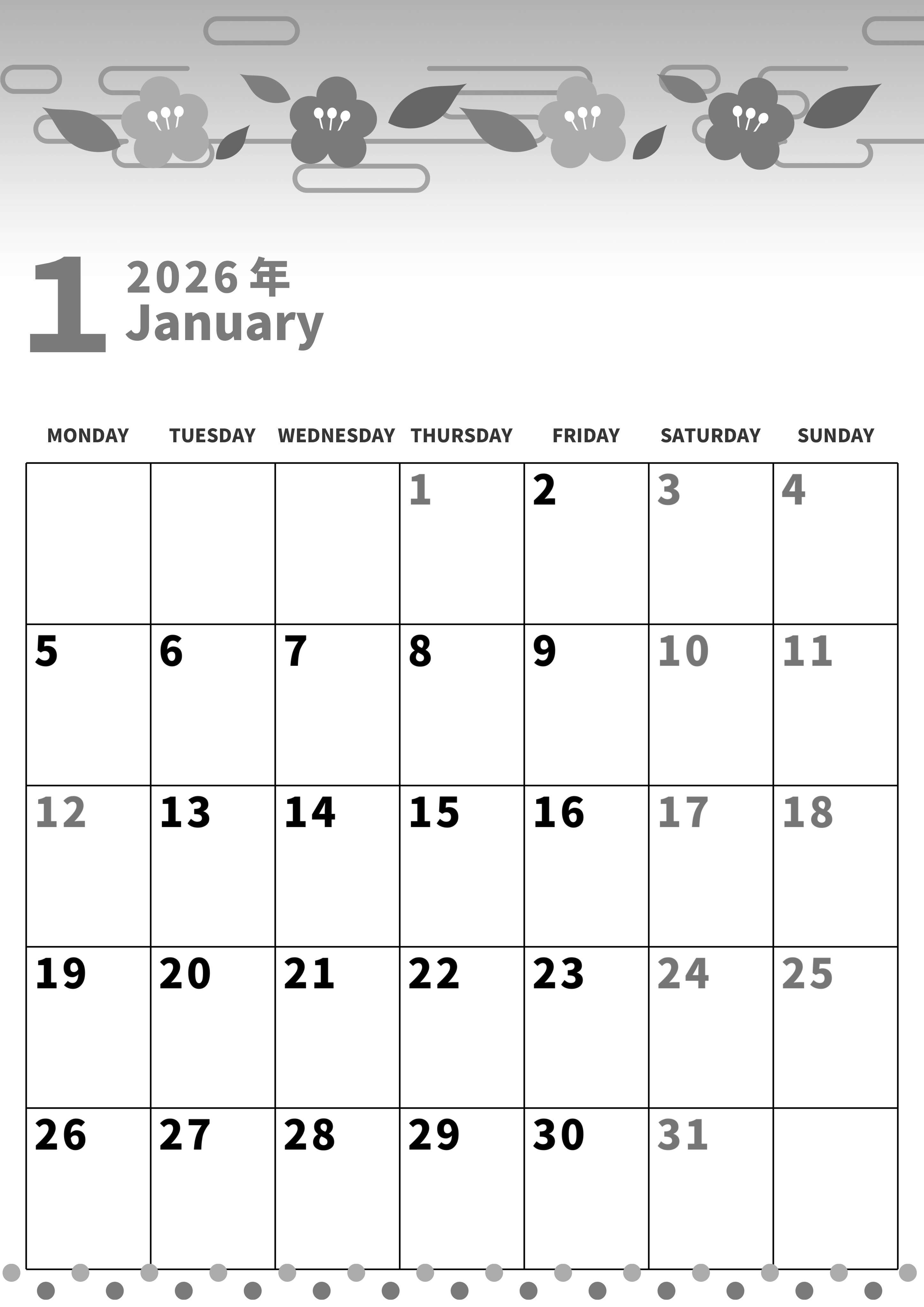 2026年1月カレンダー縦型で月曜始まりのフリー素材です。お仕事をされている方や子育てをされている方にとってとても見やすいかわいい白黒のカレンダーなので2026年のスタートダッシュである1月にぴったりなファミリー向けなレイアウトとなっています。