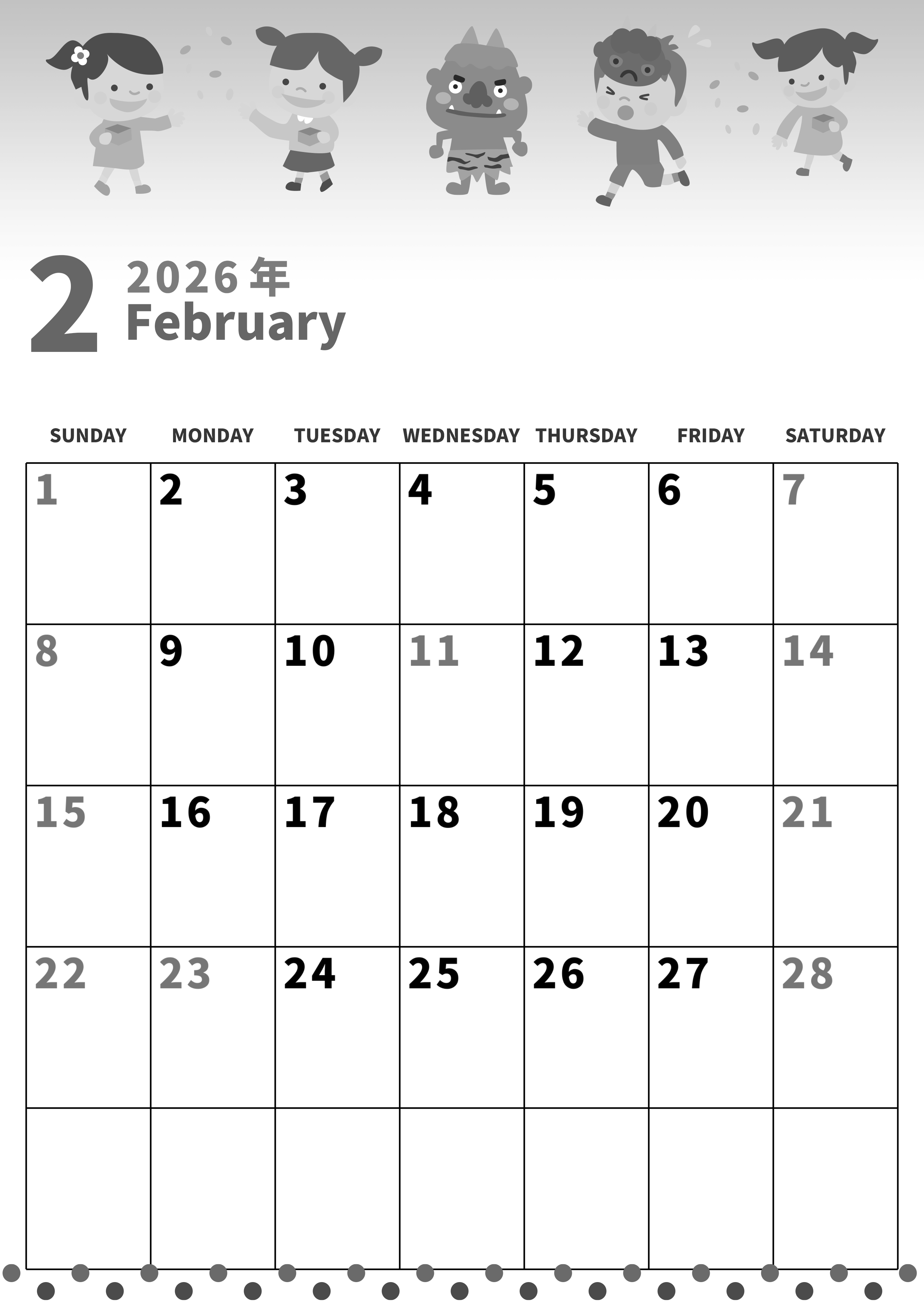 2026年・無料のカレンダーテンプレート 2026年2月縦型モノクロの日曜始まり 豆と鬼イラストのかわいいA4無料白黒のカレンダー(2026-00270210) 素材状デザイン王 2025年4月1日 2026年2月縦型モノクロの日曜始まりの無料テンプレート白黒のカレンダーです。小学生くらいの子供たちが節分の豆まきをして遊んでいるかわいいイラストの白黒のカレンダーです。気持ちが洗われるようなクリアなテイストでもあります。 2月 縦型のカレンダー 日曜始まり 白黒 カレンダーデザイン-0027