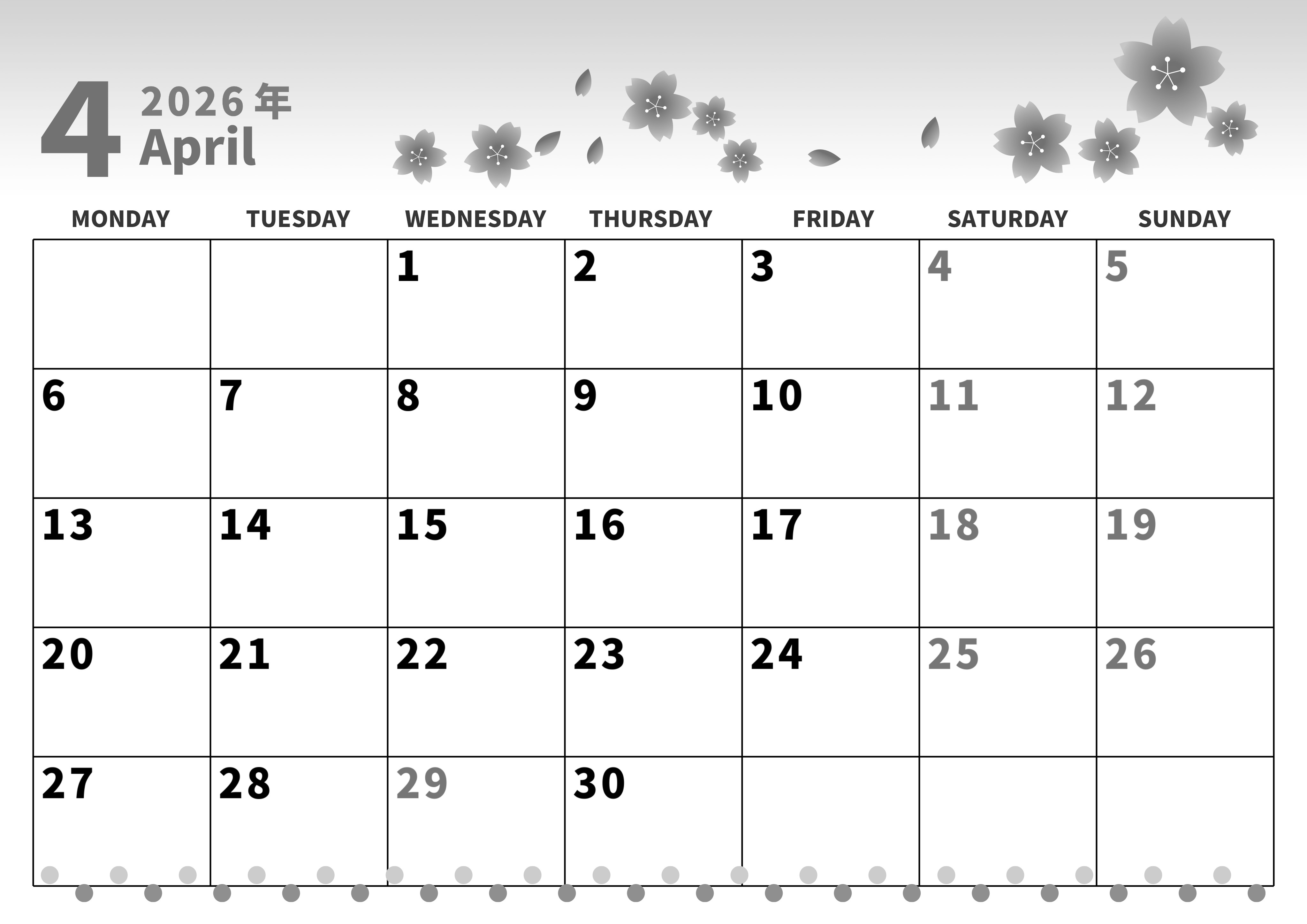 2026年・無料のカレンダーテンプレート 2026年4月横型モノクロの月曜始まり 満開桜イラストのかわいいA4無料白黒のカレンダー(2026-00270401) 素材状デザイン王 2025年4月1日 2026年4月横型モノクロの月曜始まりの無料テンプレート白黒のカレンダーです。春爛漫という言葉がぴったりな満開桜のイラストがかわいい白黒のカレンダーです。月曜始まりで書き込みしやすいフォーマットとなっています。 4月 横型のカレンダー 月曜始まり 白黒 カレンダーデザイン-0027