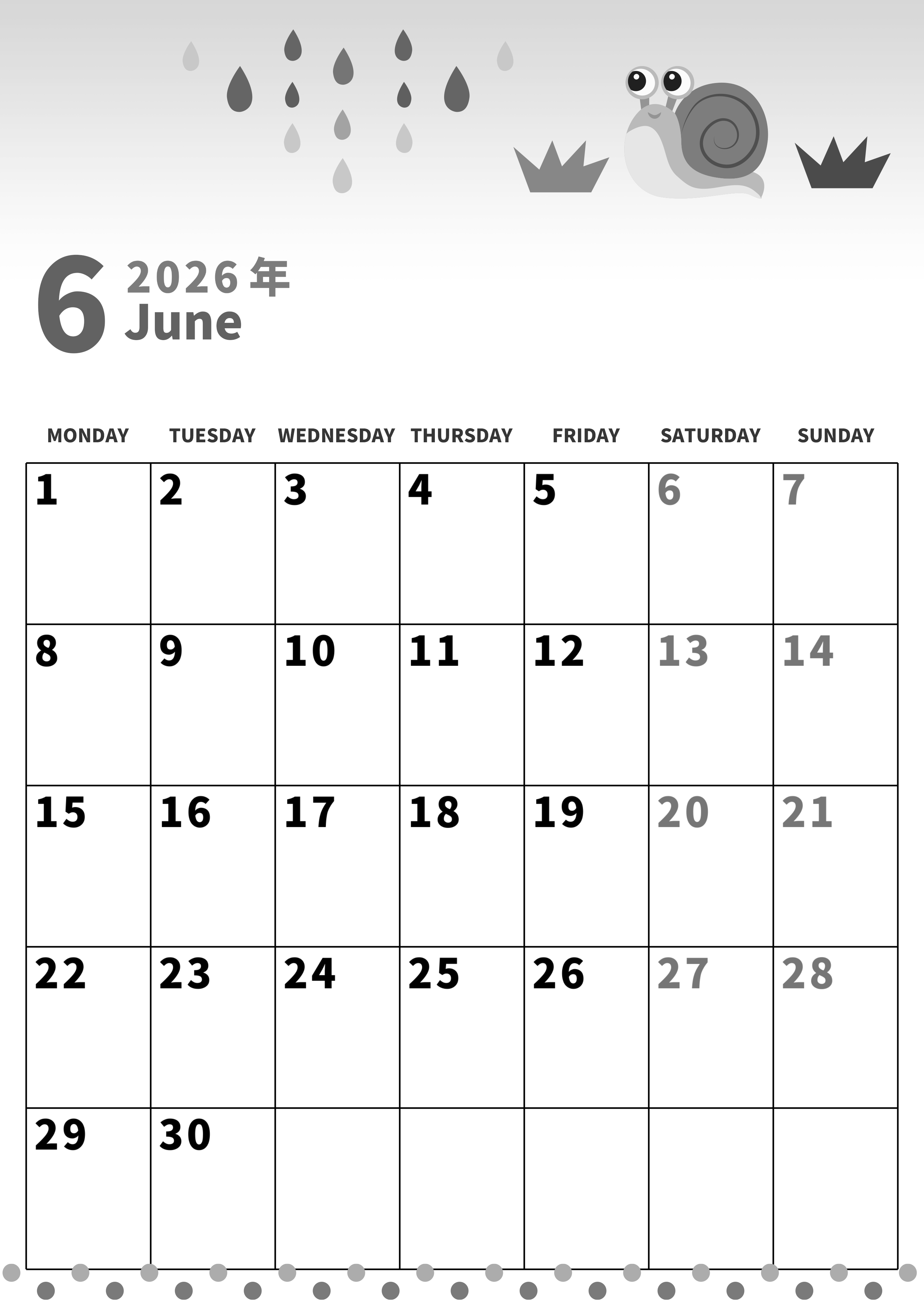 2026年6月縦型モノクロの月曜始まりの無料テンプレート白黒のカレンダーです。月曜始まりで縦向きのモノクロのカレンダーをお探しの方におすすめしたいフォーマットです。イラスト部分は梅雨に出てくるかたつむりや雨粒を採用していてかわいいです。