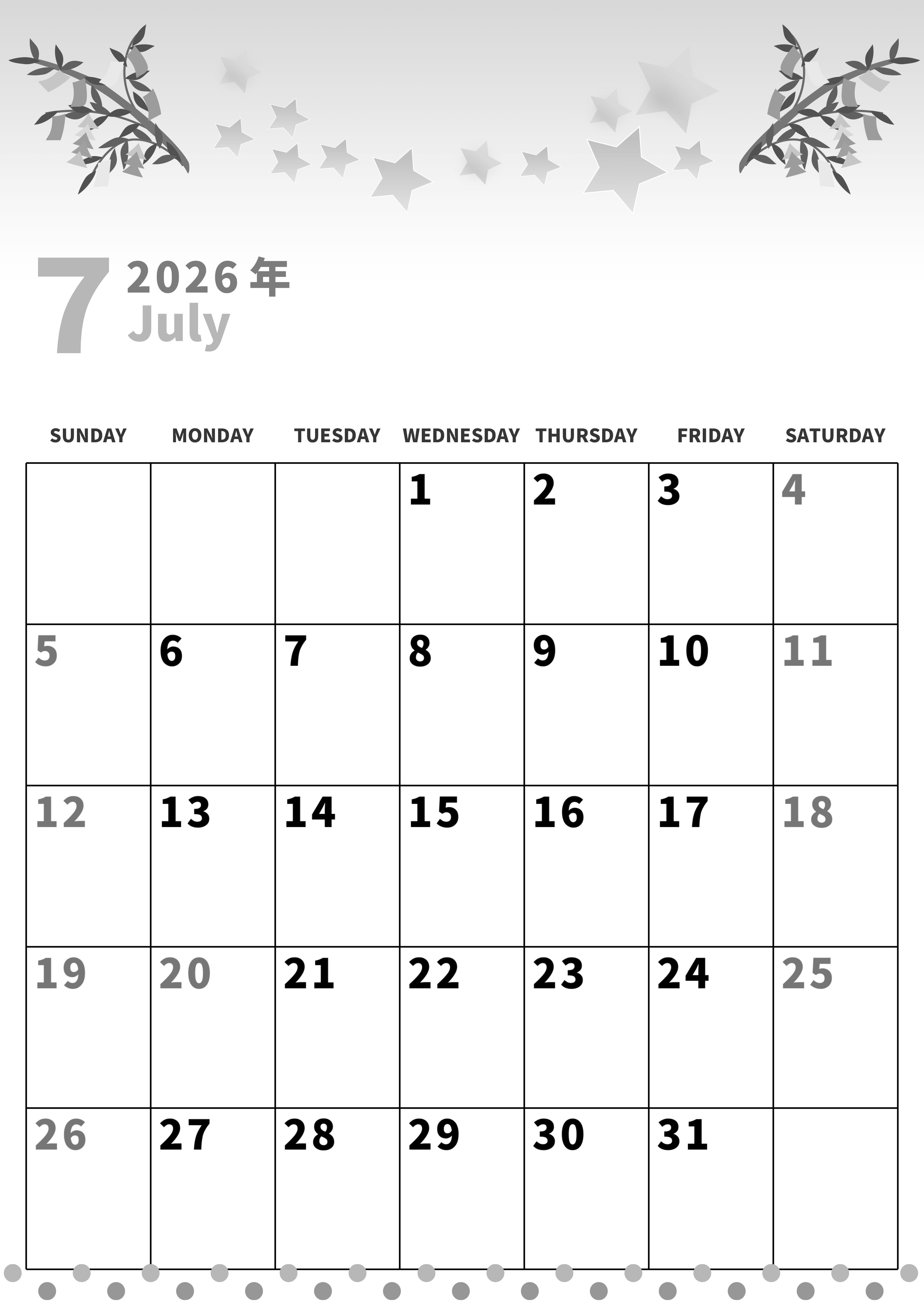 2026年・無料のカレンダーテンプレート 2026年7月縦型モノクロの日曜始まり 七夕イラストのかわいいA4無料白黒のカレンダー(2026-00270710) 素材状デザイン王 2025年4月1日 2026年7月縦型モノクロの日曜始まりの無料テンプレート白黒のカレンダーです。印刷をするだけですぐに活用が可能なイラスト白黒のカレンダーです。七夕シーズンを楽しく過ごすのに適しているかわいいデザインとなっています。 7月 縦型のカレンダー 日曜始まり 白黒 カレンダーデザイン-0027