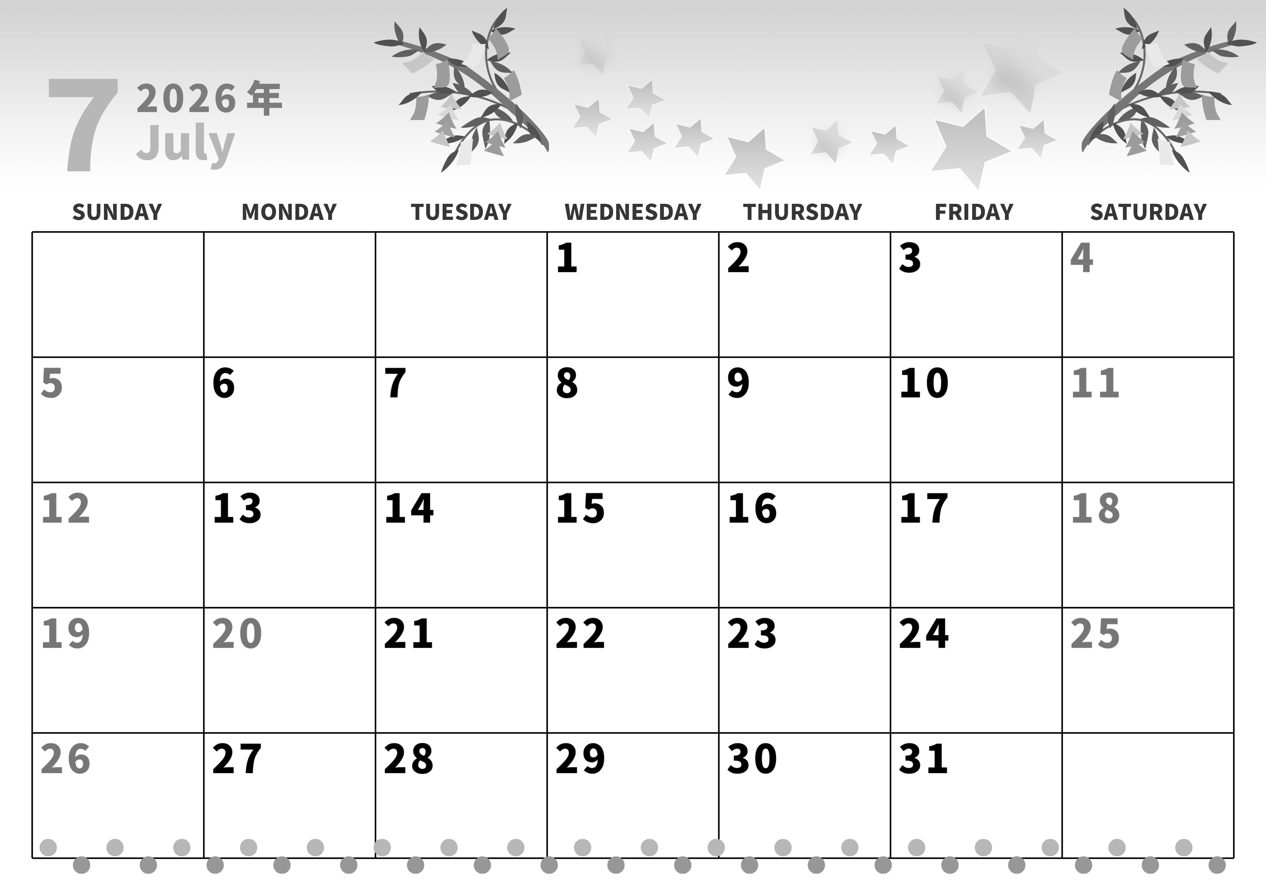 2026年・無料のカレンダーテンプレート 2026年7月横型モノクロの日曜始まり 七夕イラストのかわいいA4無料白黒のカレンダー(2026-00270700) 素材状デザイン王 2025年4月1日 2026年7月横型モノクロの日曜始まりの無料テンプレート白黒のカレンダーです。七夕の願い事がたくさんつけられた笹と星のイラストがかわいい白黒のカレンダーはレイアウトが実用的なので予定を書き込みやすいです。 7月 横型のカレンダー 日曜始まり 白黒 カレンダーデザイン-0027