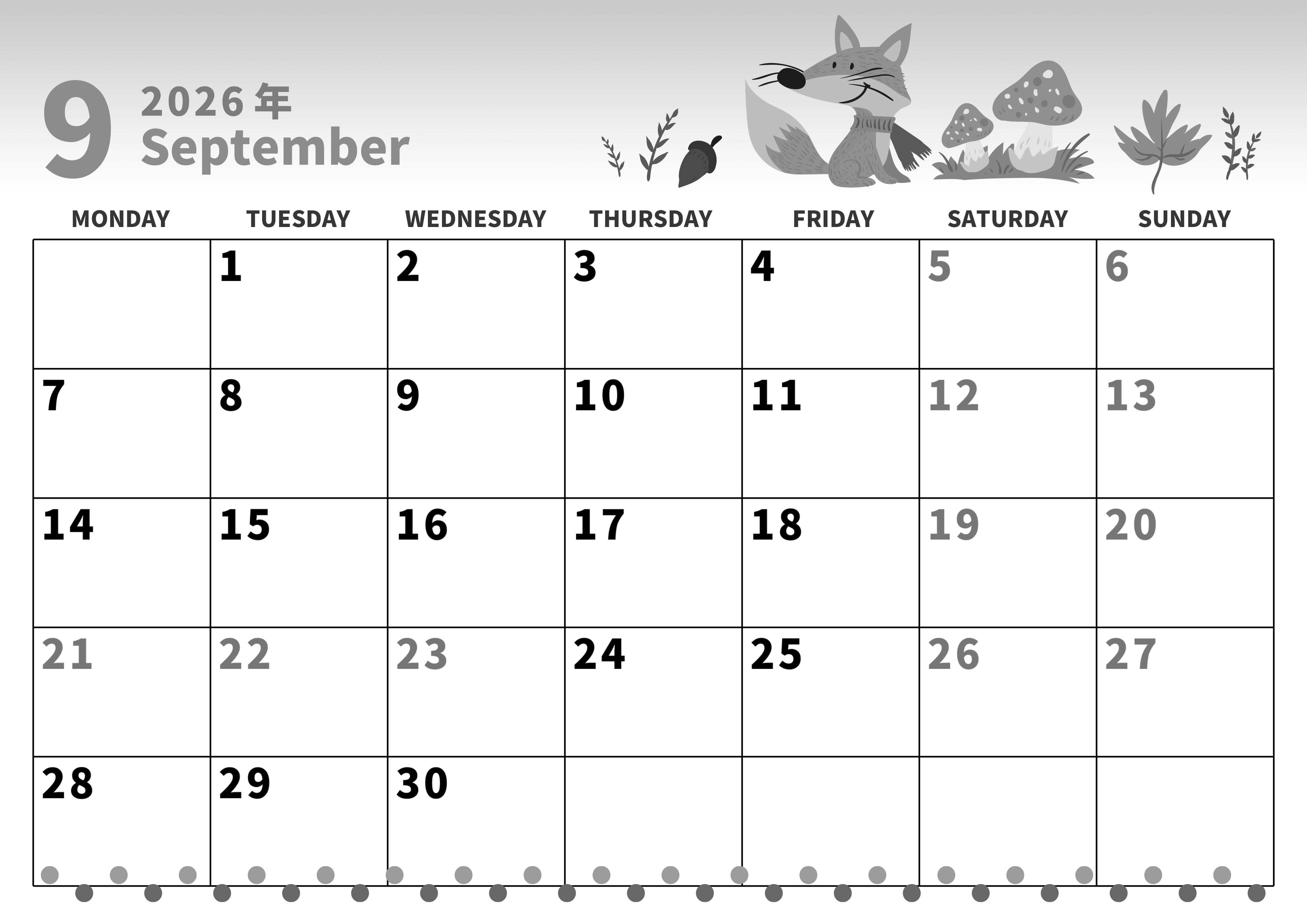 2026年・無料のカレンダーテンプレート 2026年9月横型モノクロの月曜始まり キツネのイラストがかわいいA4無料白黒のカレンダー(2026-00270901) 素材状デザイン王 2025年4月1日 2026年9月横型モノクロの月曜始まりの無料テンプレート白黒のカレンダーです。キノコやドングリやモミジに囲まれて上機嫌のキツネのイラストがかわいいです。白黒のカレンダー部分は月曜始まりのレイアウトなので使い勝手が良いです。 9月 横型のカレンダー 月曜始まり 白黒 カレンダーデザイン-0027