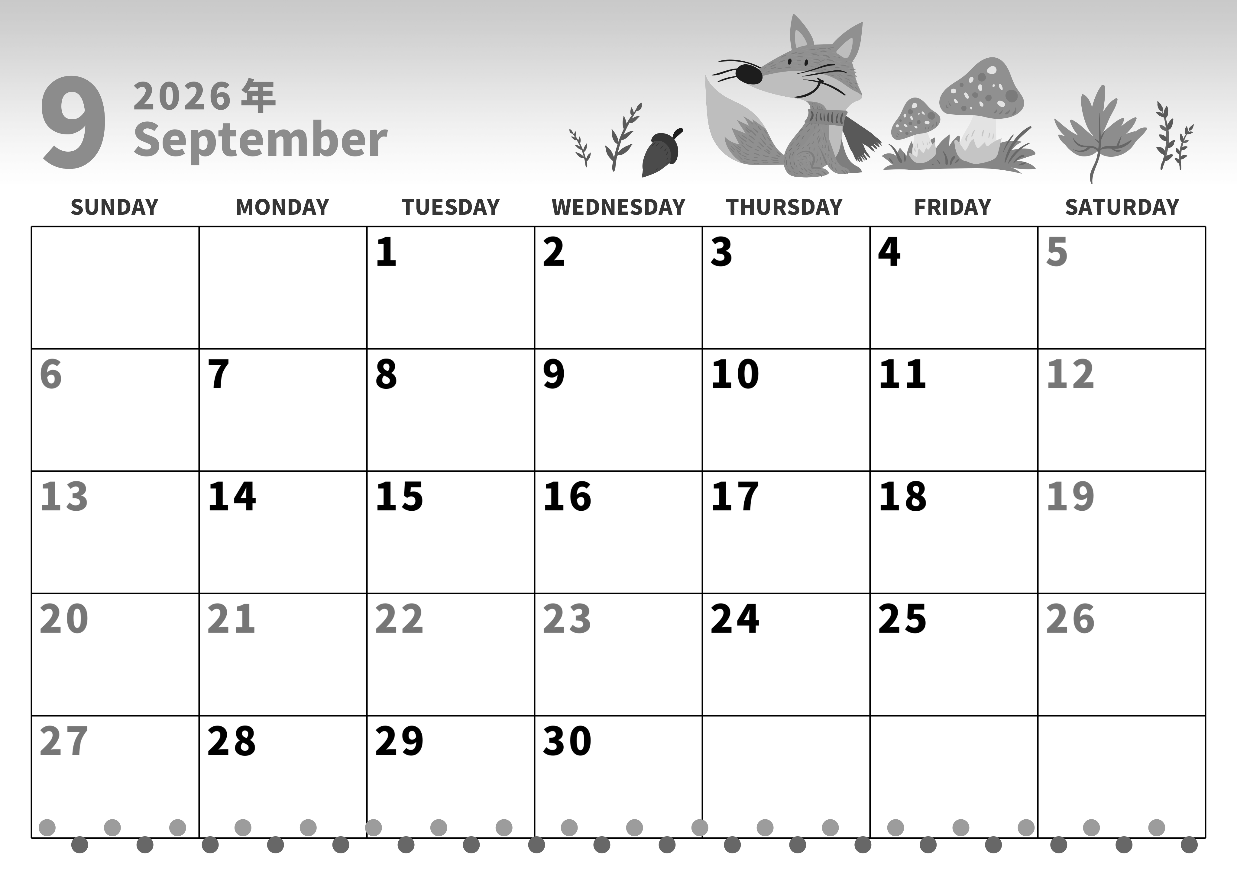 2026年・無料のカレンダーテンプレート 2026年9月横型モノクロの日曜始まり キツネのイラストがかわいいA4無料白黒のカレンダー(2026-00270900) 素材状デザイン王 2025年4月1日 2026年9月横型モノクロの日曜始まりの無料テンプレート白黒のカレンダーです。温かみのある背景にちょこんと座っているキツネとぷりっと成長しているキノコのイラストがかわいいい白黒のカレンダーです。 9月 横型のカレンダー 日曜始まり 白黒 カレンダーデザイン-0027