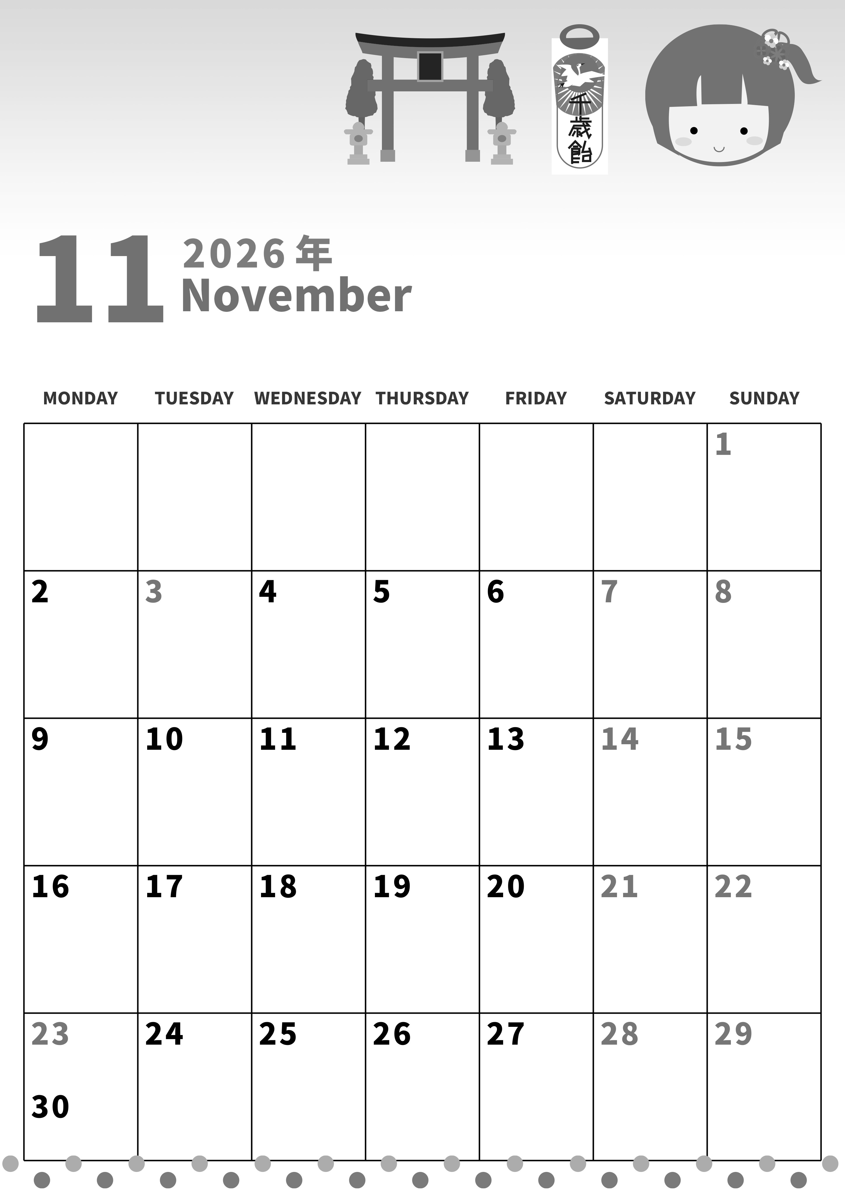 2026年・無料のカレンダーテンプレート 2026年11月縦型モノクロの月曜始まり 千歳飴イラストのかわいいA4無料白黒のカレンダー(2026-00271111) 素材状デザイン王 2025年4月1日 2026年11月縦型モノクロの月曜始まりの無料テンプレート白黒のカレンダーです。月曜始まりなので日々のプランニングがやりやすいフリー素材となっています。かわいいイラストも添えられているので使うのが楽しいです。 11月 縦型のカレンダー 月曜始まり 白黒 カレンダーデザイン-0027