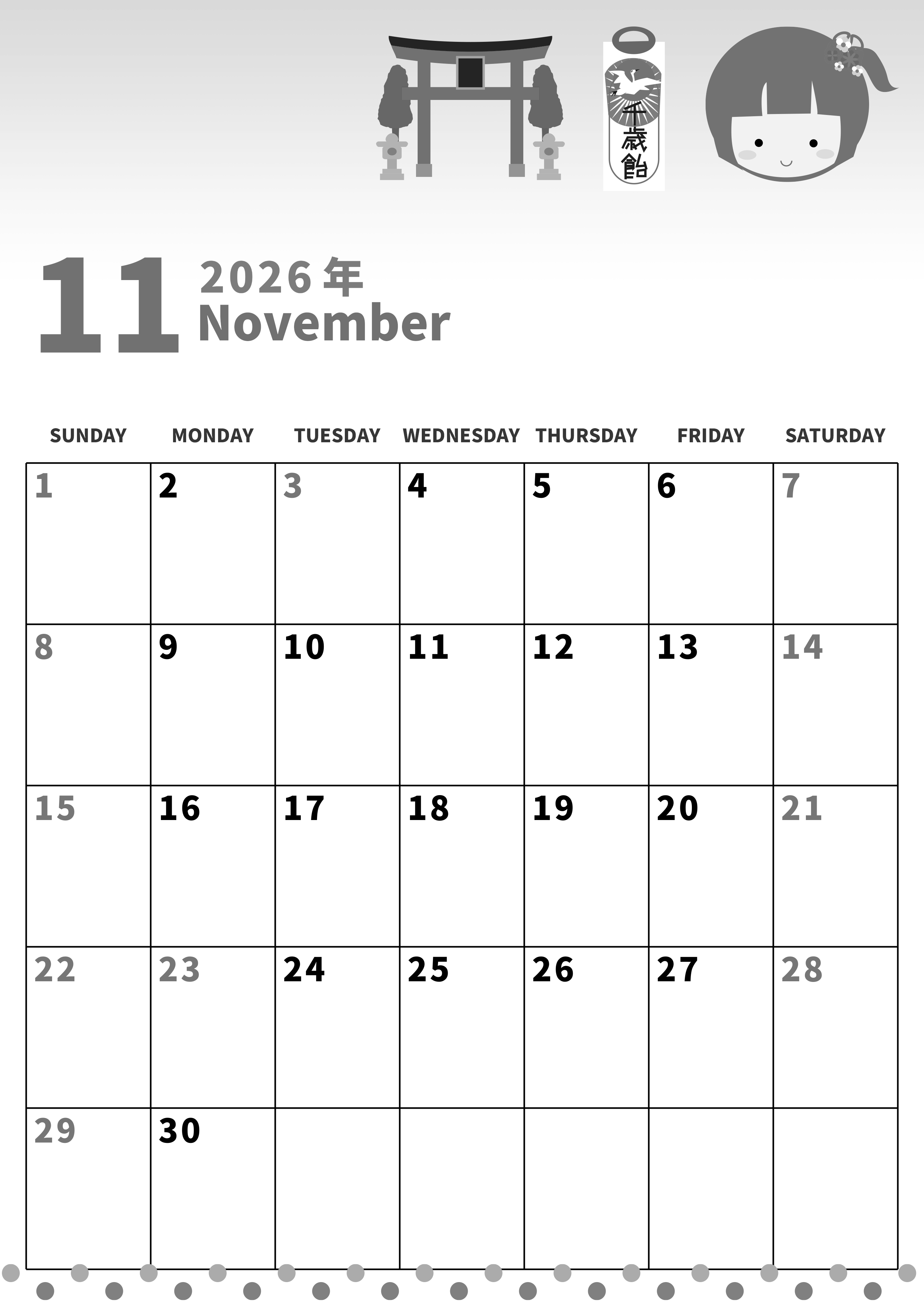 2026年・無料のカレンダーテンプレート 2026年11月縦型モノクロの日曜始まり 千歳飴イラストのかわいいA4無料白黒のカレンダー(2026-00271110) 素材状デザイン王 2025年4月1日 2026年11月縦型モノクロの日曜始まりの無料テンプレート白黒のカレンダーです。白黒のカレンダーの下のフレームに施されているドットの組み合わせも細かくかわいいイラスト付きの使い勝手の良い素材となっています。 11月 縦型のカレンダー 日曜始まり 白黒 カレンダーデザイン-0027