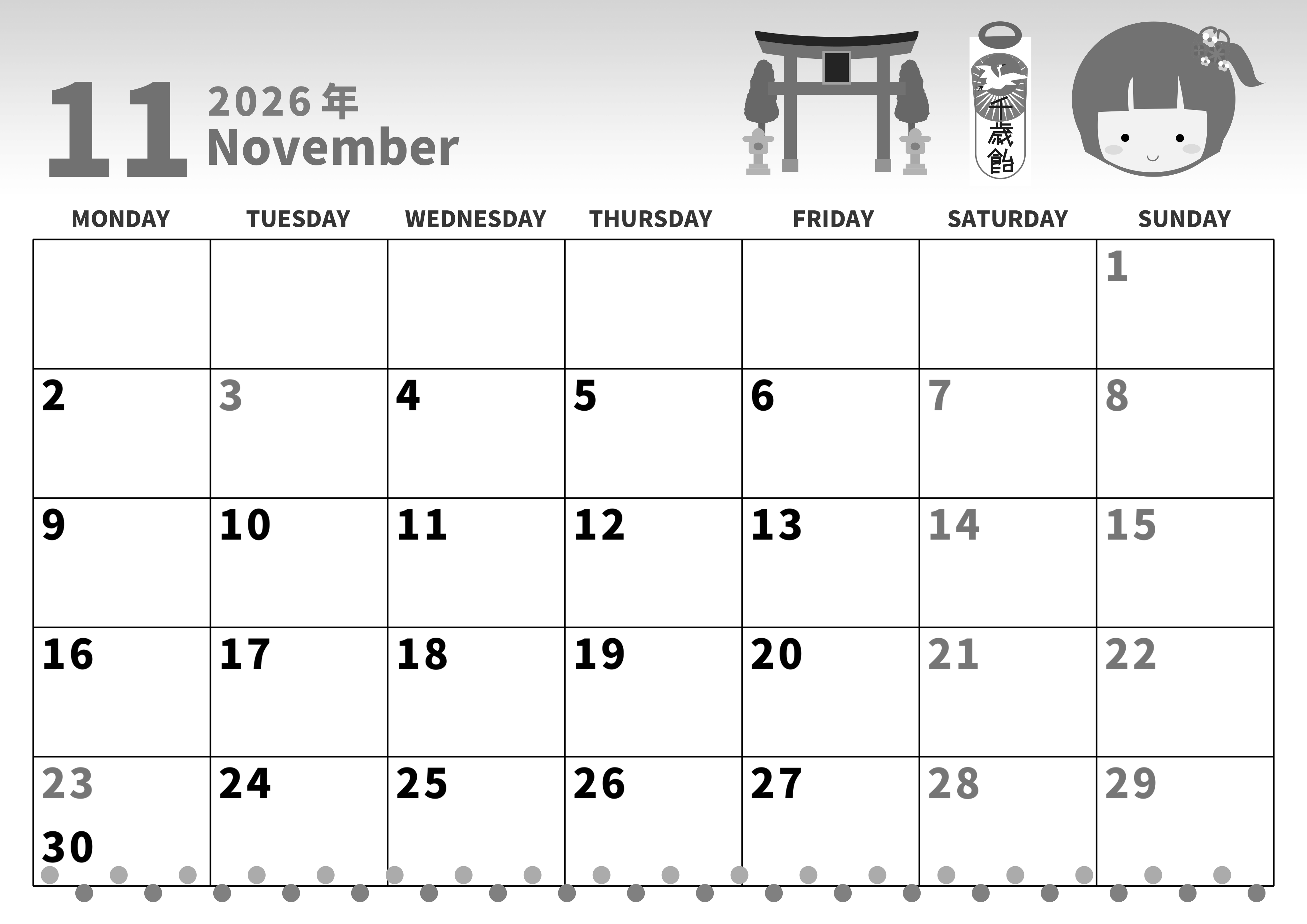 2026年11月横型モノクロの月曜始まり 千歳飴イラストのかわいいA4無料白黒のカレンダー(2026-00271101)