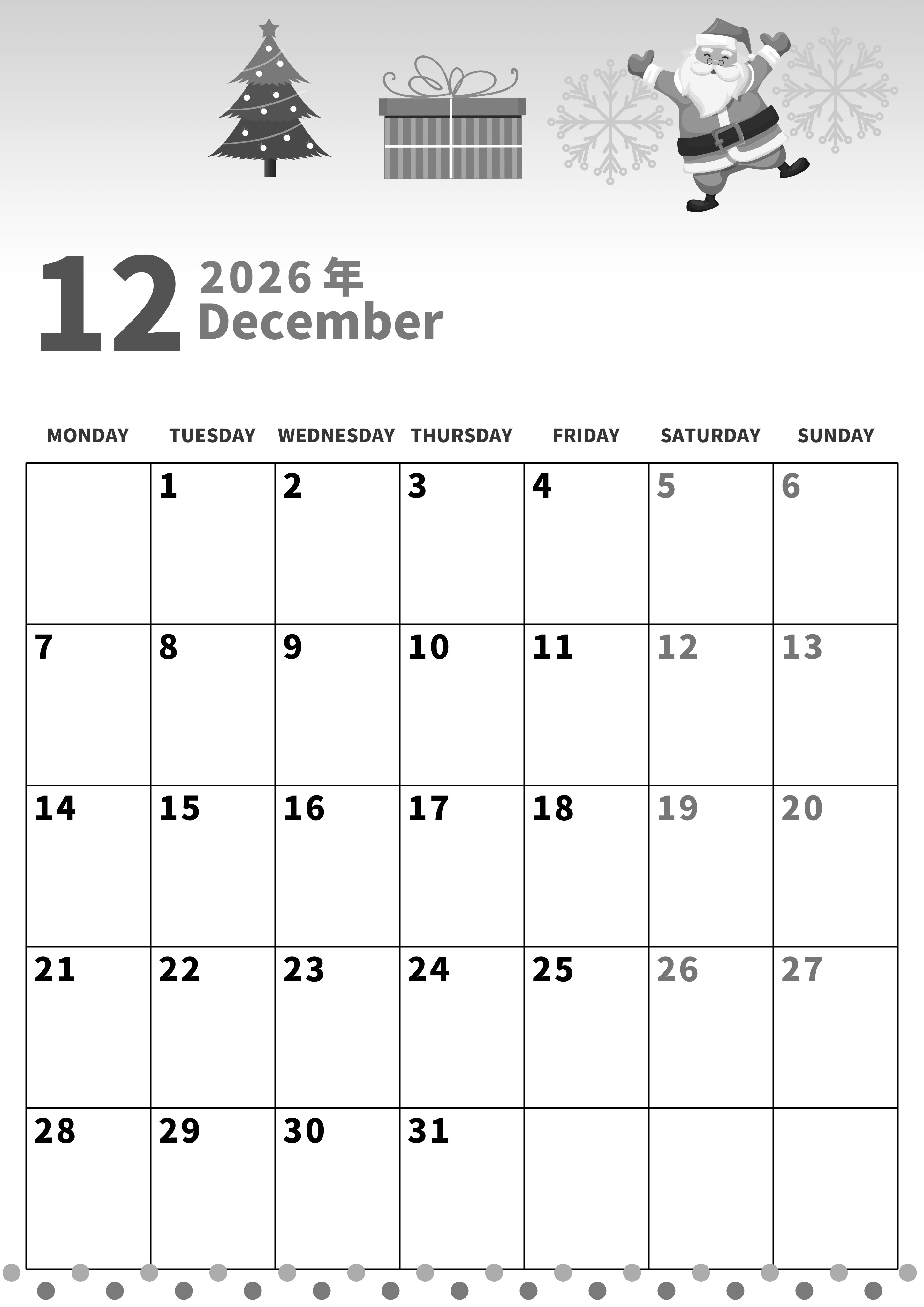 2026年12月縦型モノクロの月曜始まりの無料テンプレート白黒のカレンダーです。大きなクリスマスプレゼントボックスのイラストが中心に描かれているかわいい雰囲気のワクワクするような曜日ごとに文字の色が湧けられている白黒のカレンダーです。