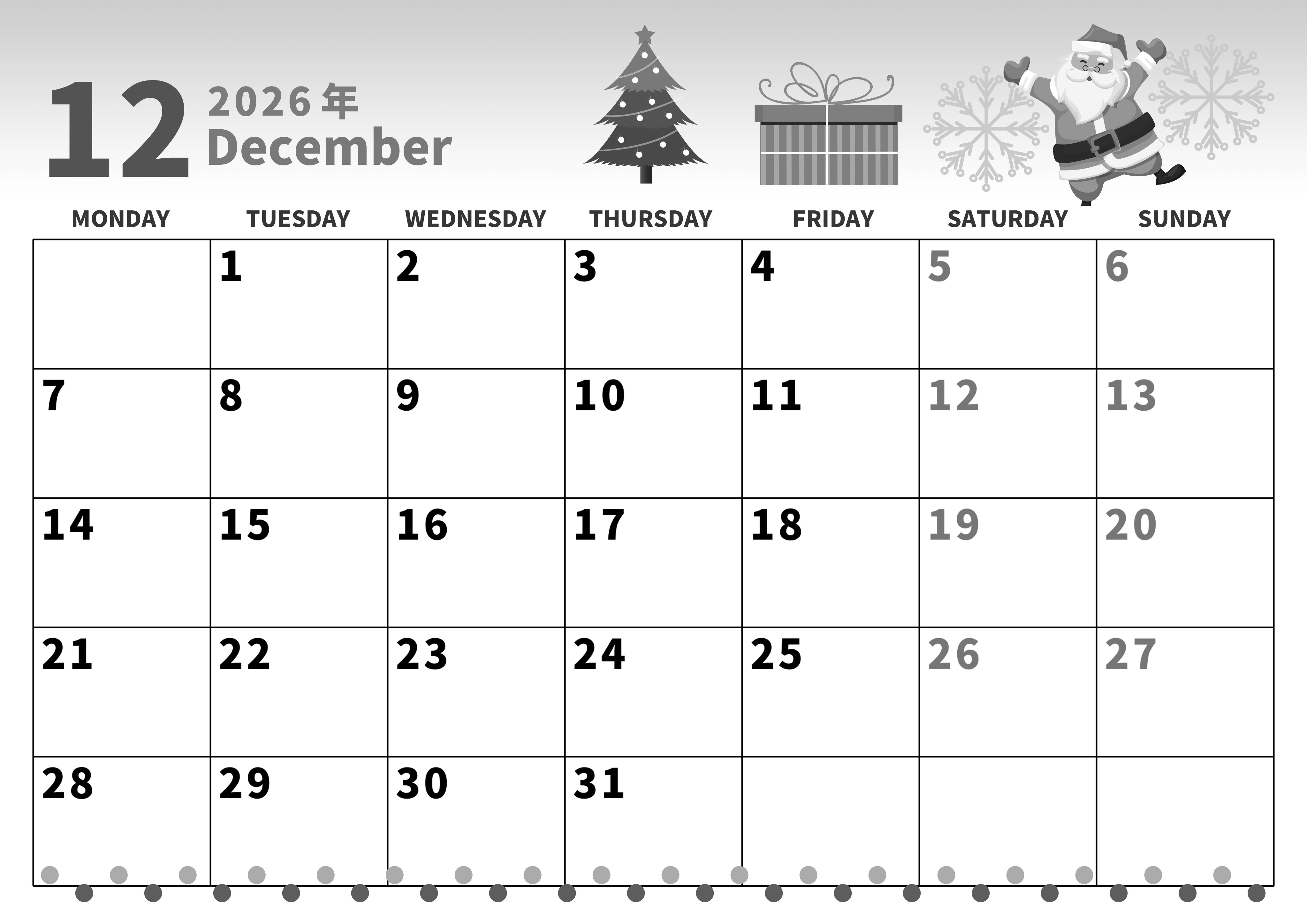 2026年12月横型モノクロの月曜始まりの無料テンプレート白黒のカレンダーです。クリスマスをテーマにしているイラストがグラデーションの背景に映えるときめきを感じさせてくれるかわいい雰囲気のフリー素材です。