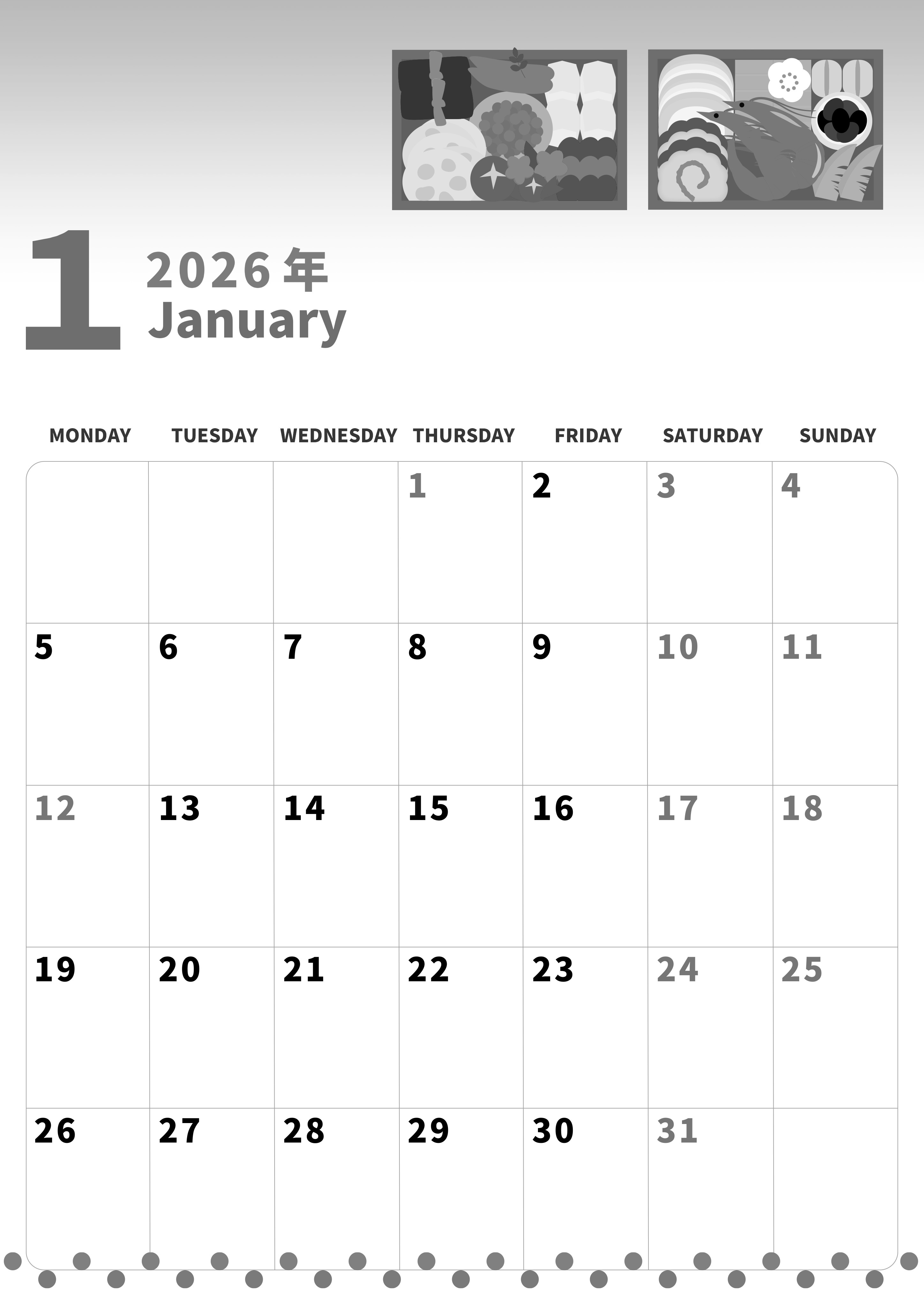 2026年の1月の予定を立てるのに一役買う白黒カレンダーです。月曜始まりで縦型なので壁に貼って使うも良しです。新年のおめでたい雰囲気を後押ししてくれるおせち料理のイラストが細かく描かれているのでじっくり見て楽しむ事もできます。かわいい白黒カレンダーのダウンロードは無料です。(2026-00280111)