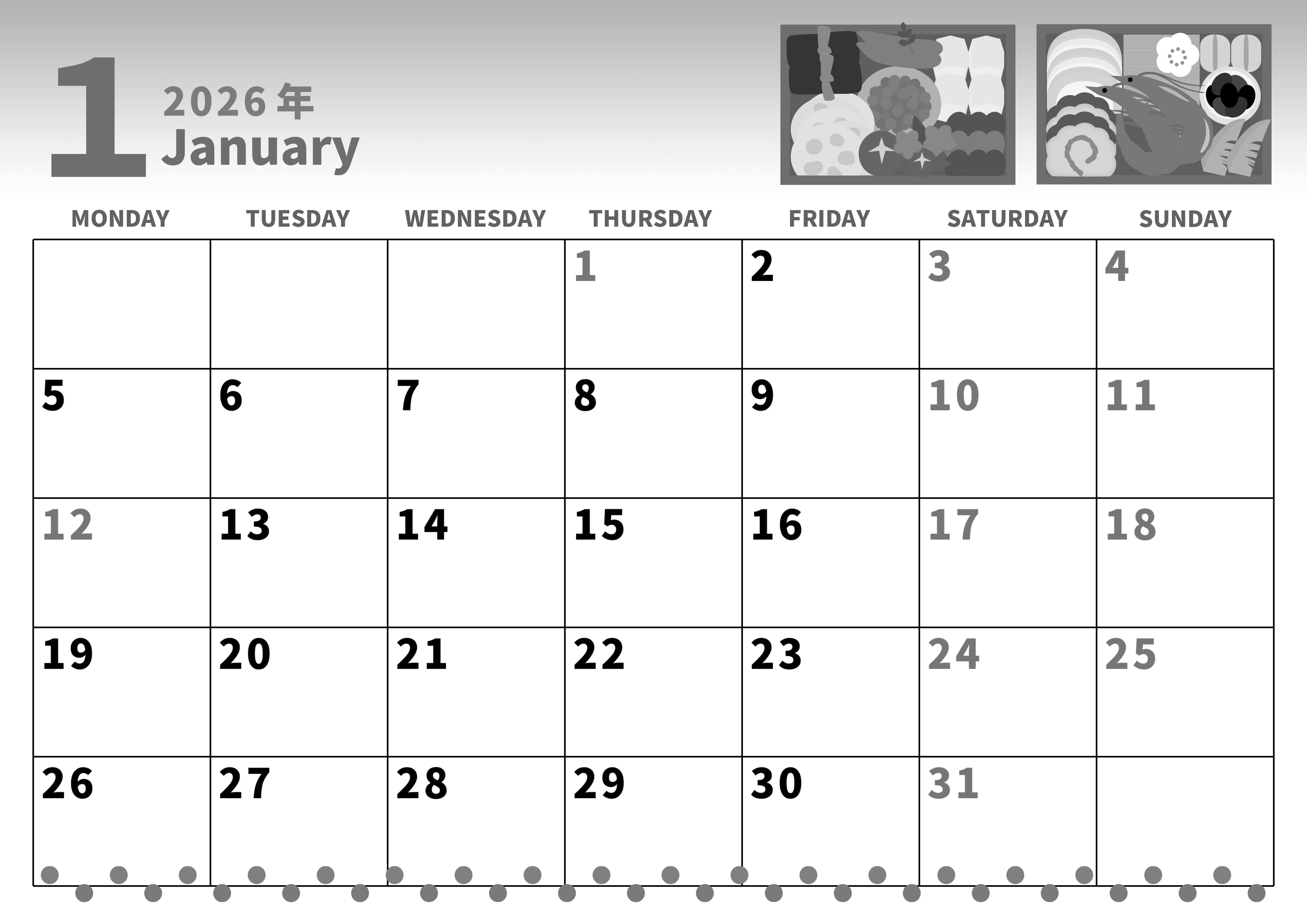 2026年の1月の行事を把握するのに最適な横向き白黒カレンダーをお探しの方へ。月曜始まりでおせち料理の画像がかわいいイラスト素材を無料ダウンロード可能です。1月はイベントが次から次へと舞い込んできます。家族でも単身者でも多忙な新年となります。タスク管理に役立つ白黒カレンダーです。(2026-00280101)