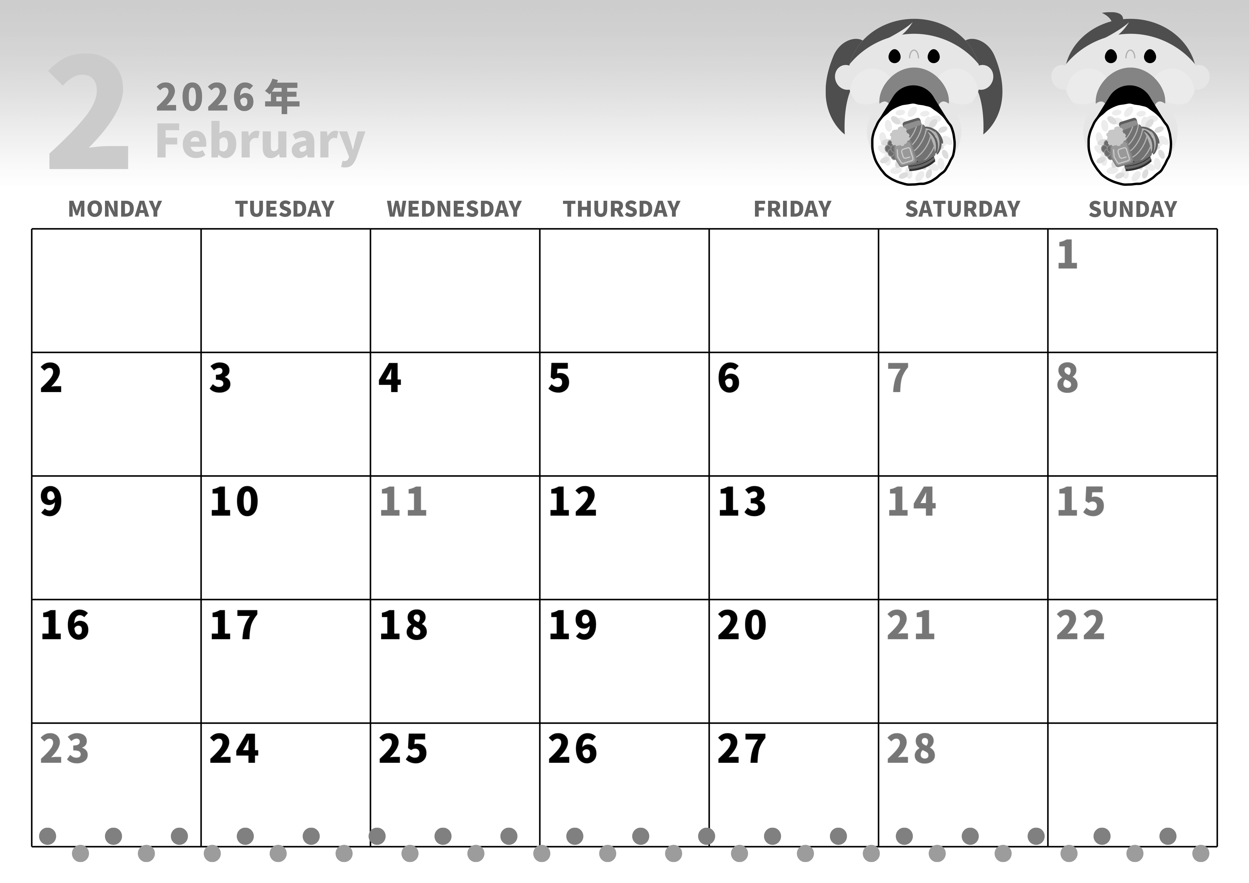 2026年2月横型モノクロの月曜始まりの無料テンプレート白黒カレンダーです。グラデーションをデザインしたかわいいガーリーな白黒カレンダーです。イラストには恵方巻きをピックアップしていて予定も書き込みしやすいです。(2026-00280201)